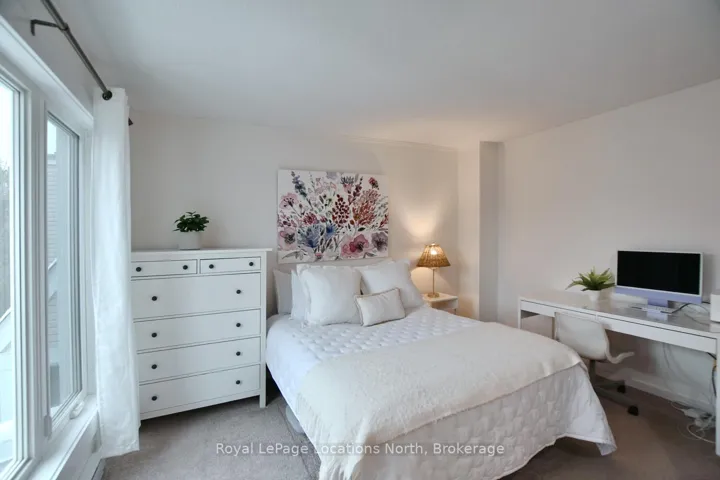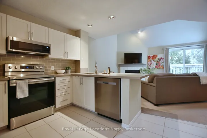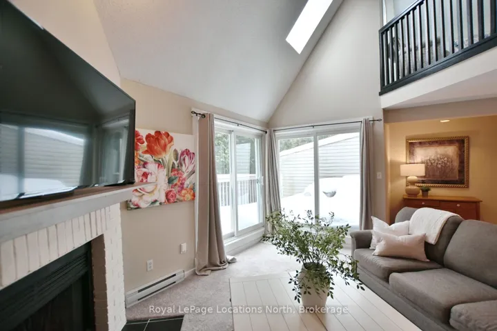 Welcome to this beautifully updated 2 bedroom, 2 bathroom condo nestled in one of Collingwood’s most desirable and peaceful settings. Perfectly positioned close to the water, ski hills, scenic trails, and vibrant downtown, this home offers the ideal balance of privacy, convenience, and four-season living. Set well away from traffic noise, the unit enjoys a quiet, treed backdrop with a large private deck overlooking mature trees – an ideal space to relax, entertain, or simply enjoy the natural surroundings. Whether sipping morning coffee or unwinding after a day on the trails, this outdoor area adds exceptional value and tranquility. Inside, the open-concept layout is bright and inviting, enhanced by vaulted ceilings that create a spacious and airy feel. Large windows flood the space with natural light, making the living areas feel warm and welcoming throughout the day. A cozy fireplace anchors the main living space, offering comfort and charm during cooler months. The thoughtfully designed floor plan provides excellent separation of living and sleeping areas. The main floor bedroom features has access to aa full bathroom, creating a private retreat, while the unique lofted second bedroom adds architectural interest and versatility – perfect for guests, a home office, or a cozy den. Kitchen and main bathroom have been tastefully updated, complementing the home’s overall modern yet comfortable aesthetic. Well maintained and move-in ready, this condo is ideal as a full-time residence, weekend escape, or investment opportunity. Enjoy easy access to Georgian Bay, Blue Mountain, local shops, restaurants, and recreational amenities, all while coming home to a quiet, private setting surrounded by nature. A rare opportunity to own a bright, stylish condo in a prime Collingwood location – offering comfort, privacy, and lifestyle in one exceptional package. Book your tour now!