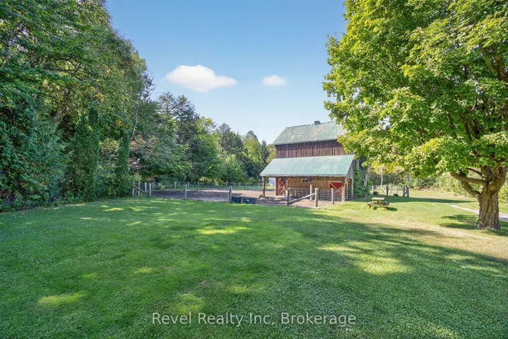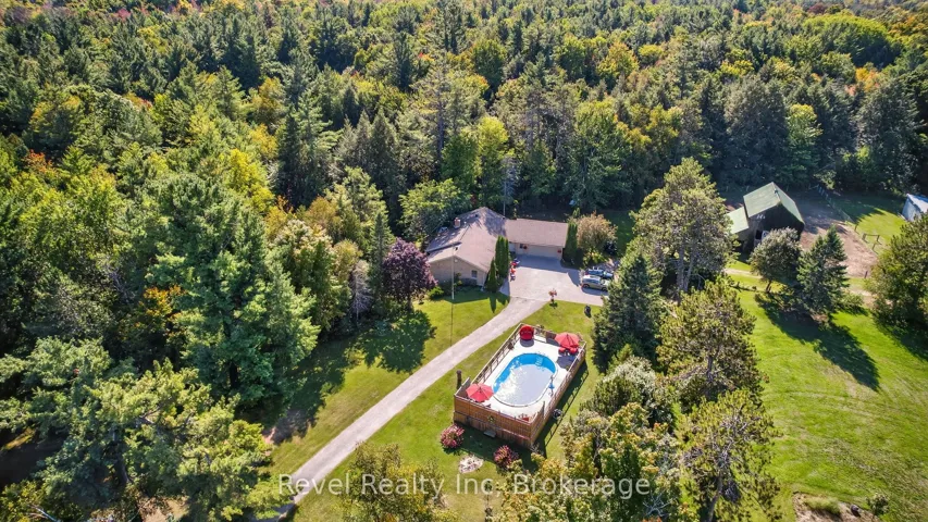 Welcome to your own private 48.39-acre retreat-an exceptional opportunity to trade city noise for space, privacy, and a more meaningful pace of life. A winding, tree-lined driveway leads you in, where three striking old-growth white pines-known as the “Three Sisters”-set the tone for the natural beauty and tranquility found throughout the property. The custom-built bungalow is designed for comfort and entertaining, featuring cathedral ceilings, a double-sided gas fireplace, and triple-pane windows framing views of the pond, creek, and landscape. The main floor offers a spacious kitchen with walkout to the deck, a primary suite with ensuite, main-floor laundry, and inviting living spaces. The finished lower level adds versatility with a large rec room with wood-burning fireplace, two bedrooms, an updated bathroom, and two flexible bonus rooms-ideal for hobbies, a home business, or multi-generational living-with walkout to the backyard and garage access. Outside, enjoy a century barn with hay loft, two paddocks with trail access, a sugar shack, chicken coop, fenced pet area, and a four-bay drive-in shed for boats, equipment, or cars. Trails wind through mature forest and open meadow for year-round enjoyment. Summer days are perfect by the 18×33 above-ground pool with deck and tiki bar, while winter invites cozy nights by the fire. With numerous updates and the potential for a forest management plan offering tax savings, this unique property delivers a lifestyle as rewarding as it is peaceful.