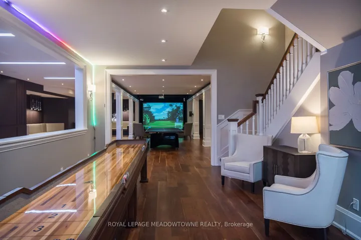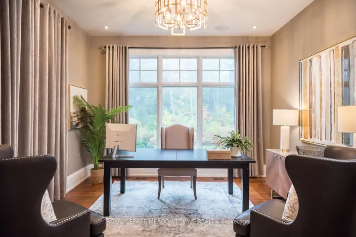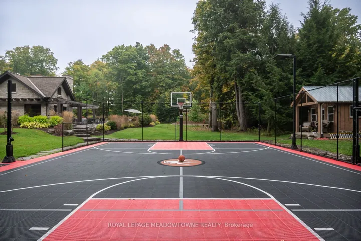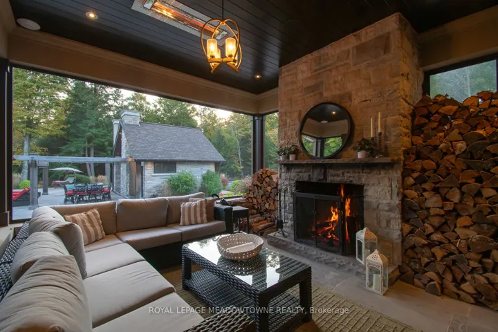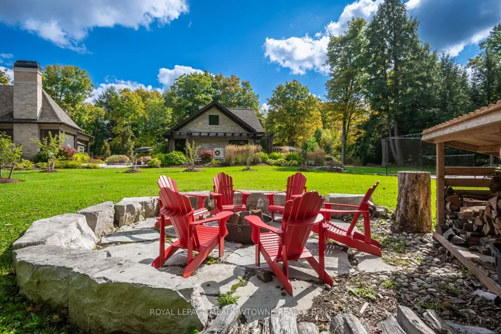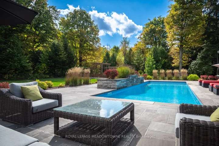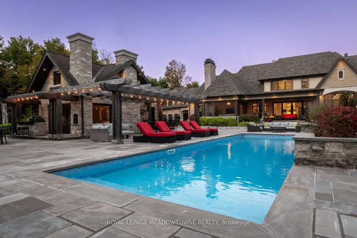 A private 5 acre estate designed for a life where everything happens at home. Just minutes from Milton, Acton, Pearson Airport, and Toronto, it offers the rare balance of privacy with everyday convenience. Designed by renowned architect David Small, the residence blends architectural presence with warmth and livability across more than 16,000 sq ft of finished space. Homes of this scale and design are rarely offered in such a private setting so close to the city. Every room was designed to connect to the surrounding landscape, where mature trees, walking trails, and landscaped grounds create a setting that feels calm and restorative. At the heart of the home, gathering spaces invite family and friends to come together, while the private primary wing offers a retreat of its own. A beautiful office and sitting area overlook the surrounding nature, creating a quiet place to work or unwind. The suite continues with dual dressing rooms, a spa inspired ensuite with heated floors and sauna, and walkout access to a secluded deck with hot tub surrounded by forest. The lower level transforms the home into a destination for entertainment and relaxation, where evenings unfold with a bowling alley, golf simulator, theatre, bar, wine cellar, and recreation spaces. A separate guest or in law suite provides independent living with its own entrance and living space, ideal for extended family or long term visitors. Outdoors, the estate unfolds like a private resort. Spend summer days by the pool, gather in the outdoor kitchen, enjoy the sport court, explore the surrounding walking trails, or tend the vegetable gardens. As evening falls, the illuminated grounds create a warm glow across the landscape, turning the property into a peaceful retreat with endless ways to enjoy every season. A private estate designed for the moments that matter most where life happens and home becomes the destination.
