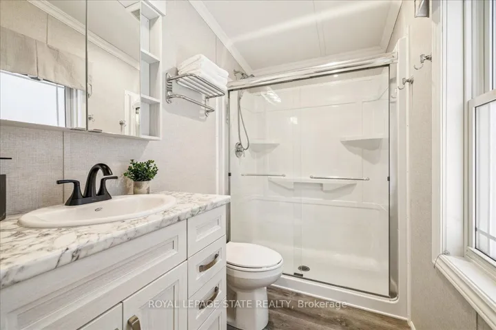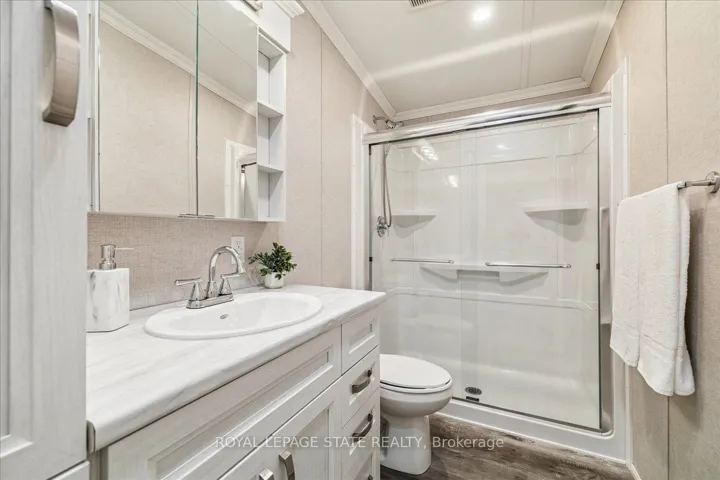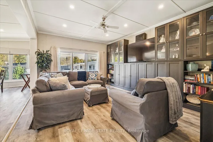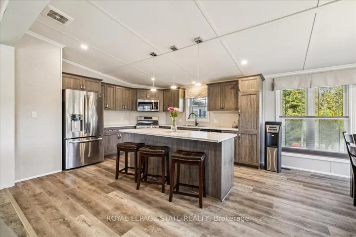 Welcome to this exceptional modular home, perfectly situated on leased land within the exclusive gated community of Lost Forest in north Burlington. Offering year-round comfort and a resort-like lifestyle, residents enjoy interior luxury and fantastic site amenities, including a seasonal pool. Step into the charming foyer and into an open-concept, single-level design, featuring soaring ceilings, and offering one of the largest spaces at 1315 Sq ft. The great room is bright and spacious with triple doors leading out to a cozy covered porch. The sunshine dinette features corner windows with eight large panels of glass. Some many things to appreciate including an upgraded kitchen with crown molding and large island, luxury vinyl floors front back, built-in wall cabinets in the great room, and bedrooms, offering tons of storage, in suite laundry and parking for three cars on the concrete driveway. Come and enjoy everything this worry-free, unique lifestyle has to offer!
