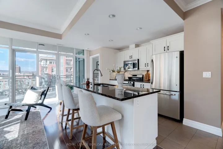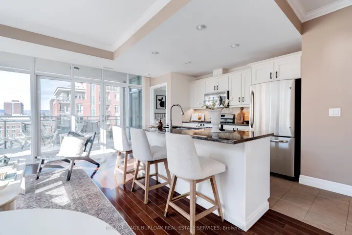 Welcome to the highly sought-after 360 Pearl-a premier building in the heart of downtown Burlington with gorgeous lake and escarpment views in every direction. This beautifully updated 2-bed, 2-bath suite offers an open-concept layout, floor-to-ceiling windows, and 9 ft ceilings, creating a bright and sophisticated living space. The kitchen impresses with custom cabinetry, pot drawers and slide-out shelving, stainless steel appliances which include a gas stove, a generous island for entertaining, and granite countertops. The Great Room is wrapped in windows, showcasing lake views and providing a seamless walkout to your expansive wrap-around balcony. The primary suite offers its own balcony access, a spacious walk-in closet with built-in organizers, and a spa-inspired ensuite with a large glass shower and extended vanity. The second bedroom features stunning lake views and a custom Murphy bed-perfect for easily transitioning between a home office and guest space. A stylish 4-piece bathroom with granite finishes and convenient in-suite laundry complete the interior. This unit truly shines for those who love to entertain. The building offers exceptional amenities including a rooftop terrace with BBQs, state-of-the-art gym with a steam room, party room, games room, movie theatre, and 24-hour concierge/security. Walk to Burlington’s best restaurants, boutique shops, Spencer Smith Park, and waterfront events. Includes 1 parking space (Level B #4) and 1 locker (Level B #57).