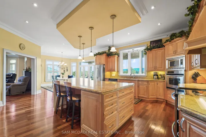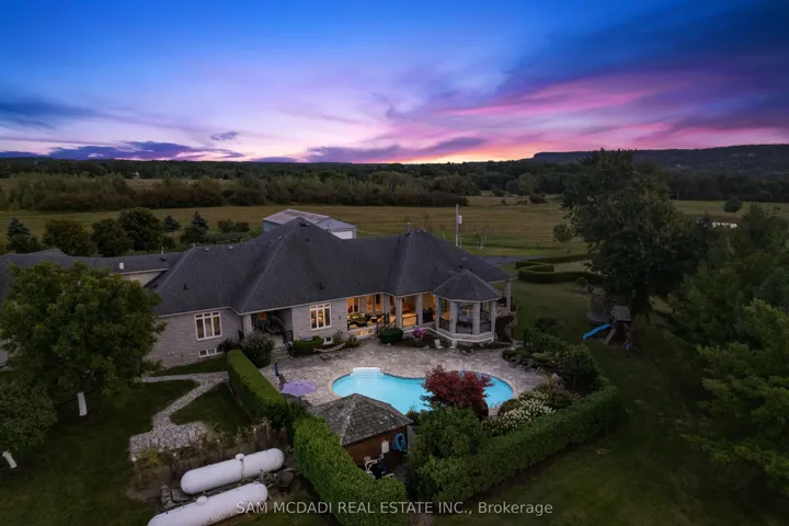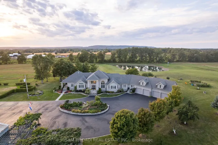 Welcome to a truly rare private estate at 5431 Appleby Lane with 87 acres of uninterrupted countryside elegance just beyond the city. Commanding attention from the very first glance a custom-designed over 19-ft entry gate offering both elegance and security, sets the tone for the prestigious property it guards. Decorative lighting fixtures provide dramatic nighttime illumination, while automated access control ensures privacy and peace of mind. Ideal for those seeking privacy, prestige, and a secure entryway to a vast estate, this gate is more than just an entrance. It’s a bold architectural feature that sets the tone for the extraordinary property beyond. This custom estate offers more than 9,300 sq ft of finished living space with four bedrooms and four bathrooms above grade plus an additional bedroom and two baths in the fully finished lower level, providing flexibility for family, guests, or staff. Designed for scale and warmth, the home places the primary suite and a second bedroom on the main level, with two more bedrooms upstairs; main rooms features 18ft ceilings. Rich Cheery hardwood runs through principal rooms and the chefs kitchen includes granite counters, built-in oven and microwave, and high end appliances; a gas fireplace anchors the main living area with premium finishes throughout. The lower level contains two recreation areas and carpeted family spaces for comfort. The Noise insulated basement has a 1200 sq ft cold cellar. Outdoors is a private resort with a finished inground pool set among interlocking patios and multiple ponds, expansive lawns and woodlands, plus room for hobby farming, equestrian use, or future development. Four garage bays, ample guest and equipment parking, a septic system and water cistern complete the property, with mechanical independence provided by two owned furnaces, two owned air conditioners, and two owned hot water tanks. Book a private showing today to experience the scale and serenity in person.