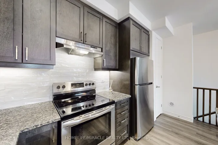Experience unparalleled luxury in this executive townhouse. This fully freehold townhouse with an all-brick and stone elevation, has great curb appeal. Offering 2 bedrooms, 2.5 baths, and an oversized 1-car garage, deep driveway with no sidewalk & parking for two cars in the driveway, this property exudes sophistication and style. From the welcoming foyer with upgraded ceramic tiles, a coat closet to the open-concept second level, every detail has been carefully crafted. The modern kitchen features upgraded cabinets, granite countertops, backsplash, breakfast bar, pendant lights, gas line and stainless steel appliances, ideal for culinary enthusiasts. Entertain effortlessly in the spacious open concept family room. Separate dining room which opens onto a covered balcony with a gas line for BBQ hookup, perfect for outdoor dining or morning coffee. Upstairs, the lavish primary suite features a large walk-in closet, 4PC full ensuite bathroom and walk-out to a balcony. The second suite has a large walk-in closet and 3PC ensuite bathroom. Laundry conveniently located on the 3rd floor with upgraded full size machines. This home is upgraded throughout with custom California shutters, raised bathroom vanities, stone counters, ceramic tiles, modern laminate floors, modern light fixtures, built-in storage cabinets and freshly painted throughout. Access door from house to garage and smart auto garage door opener installed. Ideally located near amenities, schools, library, shopping, parks and easy access to Hwy 401. Don’t miss the chance to make this exceptional home your own.