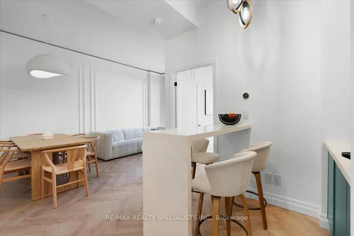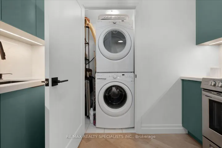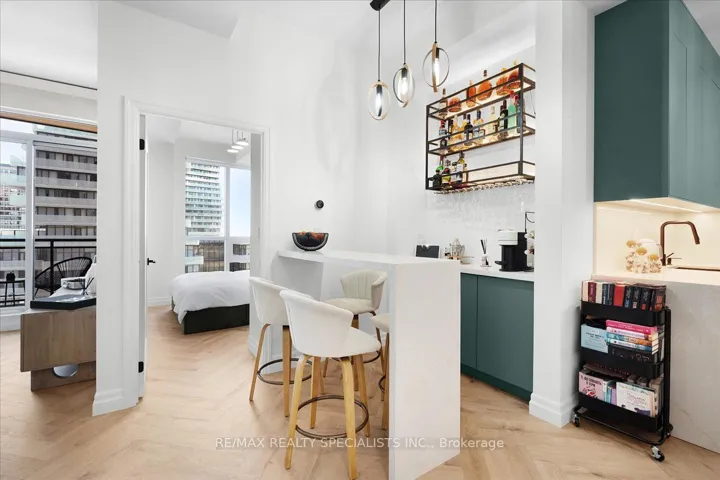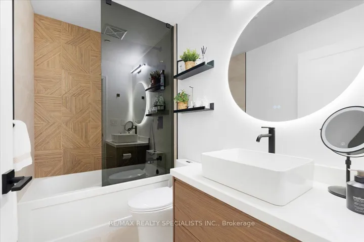 Welcome to a residence completely transformed by a high-end, custom renovation. This rare 1 bed + den, 1 bath suite is now a turnkey luxury smart home, presenting unparalleled style in Mississauga’s City Centre. Step into a sophisticated space featuring 10-foot ceilings and herringbone-pattern LVP flooring with soundproofing. The unit is unified by striking architectural details, including custom applied millwork (wainscoting) and elegant floating crown moulding with integrated LED cove lighting throughout. This fully integrated smart home provides control over every detail, including a full smart lighting system and advanced water shutoff sensors for peace of mind. The redesigned kitchen is a showpiece, featuring bespoke full-height flat-panel cabinetry, fully integrated panel-ready appliances (fridge/dishwasher), and stunning engineered quartz countertops with a matching full-height slab backsplash. The versatile den boasts a custom beverage station with a beautiful quartz waterfall countertop and LED-lit bar, perfect for entertaining. The primary bedroom is a sophisticated retreat featuring a custom fluted and wainscoted accent wall and a floor-to-ceiling wardrobe with an integrated pull-out valet/accessory tray. The spa-inspired bath includes a wall-mounted floating vanity and a dramatic smoked glass shower screen. Enjoy southeast exposure from the private balcony, upgraded with interlocking composite deck tiles. Includes a highly convenient locker on the same floor and garage parking. Located steps from Square One, transit, and major highways, this unit offers the ultimate combination of custom luxury and urban accessibility.
