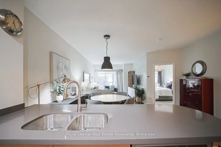 Welcome to effortless main floor living in the heart of Port Credit. This beautifully designed 1 bedroom plus den suite offers 903 sq. ft. of stylish, open concept space and the rare luxury of a true walk out terrace, not a balcony. The walk out terrace is ideal for enjoying morning coffee, gardening, and summer BBQing while creating your own private outdoor retreat.The thoughtfully designed kitchen showcases sleek grey quartz countertops, ample prep space, and a seamless flow into the spacious living and dining area, ideal for entertaining or relaxing at home. The generous primary bedroom features a walk in closet with custom organizers, while the separate den provides versatile space for a home office, guest area, or cozy reading nook.A standout feature is the walk in laundry room, offering exceptional storage and functionality rarely found in condo living. Even the storage locker is conveniently located on the same ground level for easy access.Perfectly positioned just steps to the gym, lobby, and courtyard, this suite also offers added privacy with no neighbours on one side. Skip the elevator and step directly outside to enjoy the fresh lake air.Live just moments from the waterfront, marina, boutique shops, and vibrant restaurants that make Port Credit one of Mississauga’s most desirable lakeside communities.