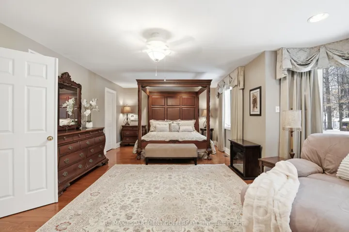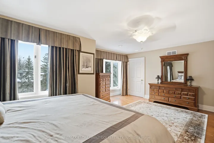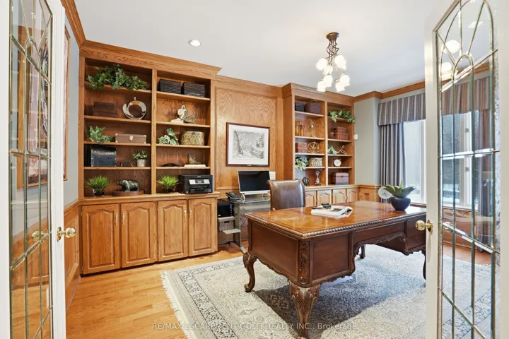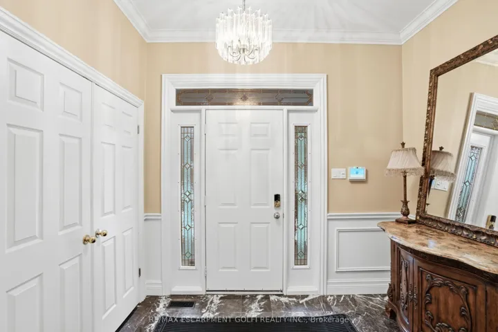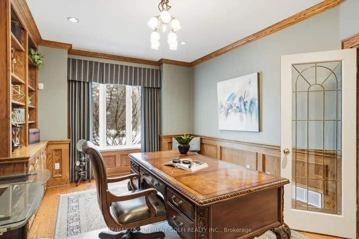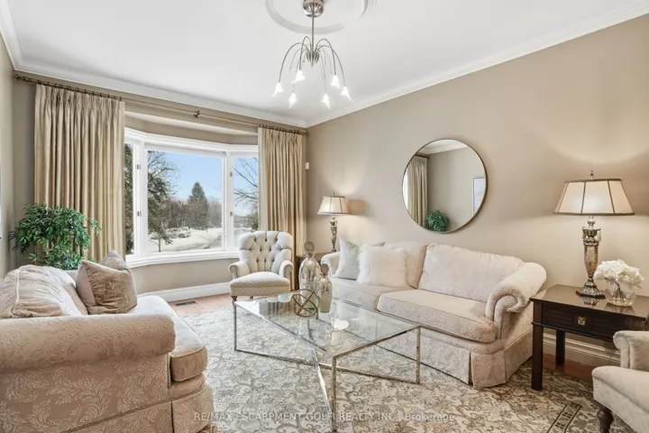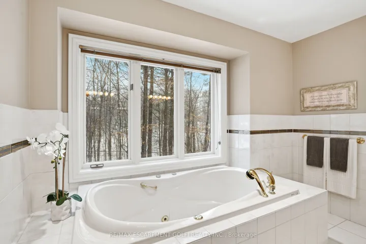 Welcome to a truly enchanting ravine estate in Burlington’s prestigious Tyandaga neighbourhood. With over 6,300 sq ft of beautifully finished living space set on an extraordinary 102′ x 220′ wooded lot, this executive residence blends timeless elegance with impressive scale and rare privacy, bordered by nature with no neighbours on two sides. A stately brick facade, triple car garage with parking for 9 vehicles, and sweeping paver driveway create a graceful arrival. Inside, soaring 9′ ceilings, rich hardwood floors, crown moulding, custom wainscoting and classic French doors evoke a sense of grandeur while remaining warm and inviting. The fully renovated Gravelle Woodworking chef’s kitchen is a showpiece, featuring solid maple cabinetry, granite countertops, premium appliances, a beverage bar and a sunlit breakfast area overlooking the tranquil ravine. The family room, centred around a striking stone gas fireplace and framed by panoramic views, feels like the heart of the home, while formal living and dining rooms offer elegant spaces for unforgettable gatherings. Upstairs reveals 4 spacious bedrooms, 4 bathrooms and a dedicated office, including a serene primary retreat with bay window, custom walk-in closet and spa-inspired 6-piece ensuite with peaceful ravine vistas. The fully finished lower level offers a private in-law suite with 2 bedrooms, ensuites, a full kitchen, laundry and multiple living areas- ideal for multi-generational living. Outdoors, unwind on the composite deck surrounded by ambient lighting, a stone fountain, irrigation system and gated ravine access. A rare and captivating blend of space, refinement and natural beauty in one of Burlington’s most coveted enclaves- truly a must see to fully appreciate. Luxury Certified.