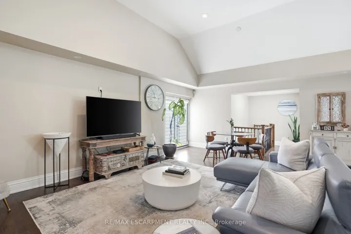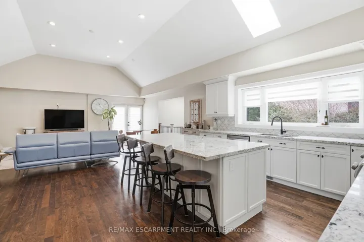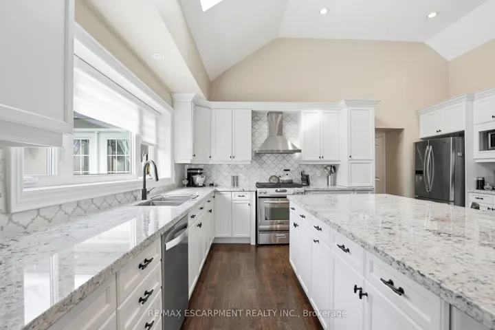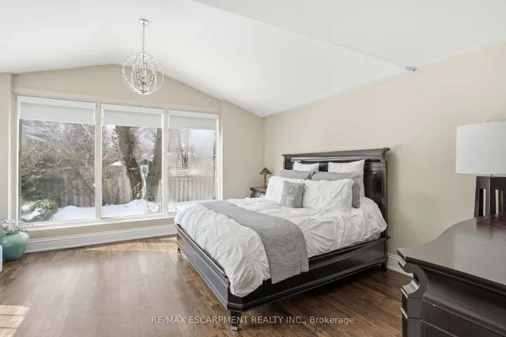 Welcome to a beautifully refined single-level residence where vaulted ceilings, natural light, and thoughtful design create an exceptional everyday living experience.From the moment you arrive, the home’s balanced façade, neutral stucco exterior, and covered portico set a tone of understated sophistication. Inside, the open-concept main level unfolds beneath soaring ceilings and skylights, allowing light to pour through the space. Rich wide-plank hardwood flooring and clean architectural lines provide warmth and continuity throughout.The kitchen is positioned at the heart of the home, featuring full-height cabinetry, quartz countertops, a large island ideal for gathering, and seamless connection to the dining area. Sliding glass doors extend the living space outdoors, creating effortless indoor-outdoor flow for entertaining.The primary suite is a private retreat with vaulted ceilings, expansive windows, French door access to the exterior, and a custom walk-in closet with built-in organization. The ensuite offers a double vanity and a glass-enclosed walk-in shower with full-height tile surround for a spa-like feel.Additional bedrooms are bright and versatile, complemented by a finished lower level offering generous recreation space with recessed lighting and durable finishes.Step outside to a fully fenced, private backyard framed by mature trees and established landscaping. An elevated wood deck and generous lawn area provide the perfect setting for outdoor gatherings or quiet relaxation.A rare opportunity to own a thoughtfully updated home that balances architectural character, functionality, and privacy in one cohesive offering.