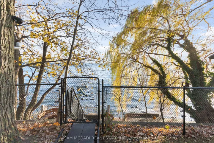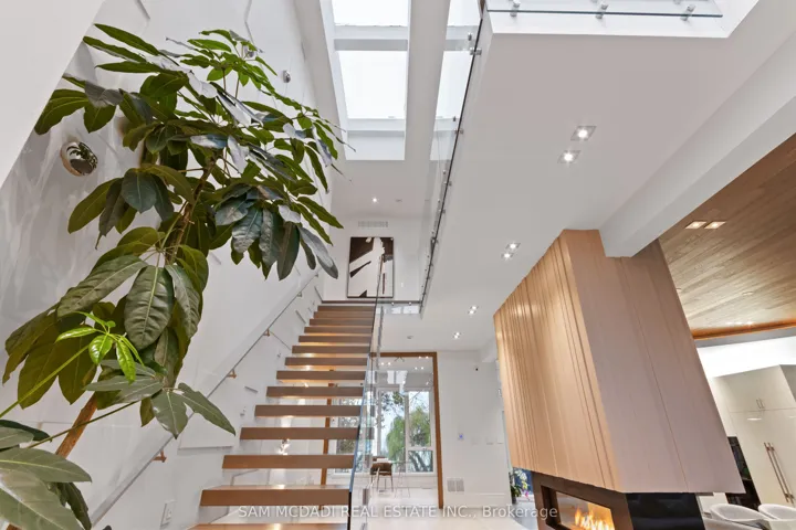 Set along South Etobicoke’s prestigious lakefront corridor, this modern estate offers over 6,200 SF of refined interiors paired with resort-style amenities seldom available. Bold in presence and uncompromising in design, it sits behind mature trees with an architectural profile that frames uninterrupted Lake Ontario views. A dramatic open-to-above foyer introduces the home, featuring a floating glass staircase, overhead skylights, and a direct views of the water. The main level unfolds as a sequence of sophisticated living spaces defined by warm wood ceilings, gallery-like walls, and a sculptural double-sided linear fireplace. Near floor-to-ceiling windows wrap the home, inviting natural light and capturing the shoreline from every angle. The chef’s kitchen delivers a magazine-worthy experience with Wolf and Sub-Zero appliances, bespoke cabinetry, a custom backsplash, and a striking central island. Adjacent living and dining zones create a fluid setting for elevated entertaining or intimate evenings. Above, 4 serene bedroom suites each offer a walk-in closet and ensuite. The lakefront primary retreat features a boutique dressing room, spa-calibre ensuite with heated floors and a freestanding tub overlooking the water, plus a private balcony for quiet reflections. The lower level extends the home’s resort-like character with a recreation lounge, bar, gym, sauna, steam room, wine cellar, and an additional guest suite, opening seamlessly to the tiered backyard. Outdoors, multiple terraces, mature landscaping, a heated pool, a hot tub, and sweeping lake vistas create a breathtaking environment for year-round enjoyment. Additional comforts include a heated driveway, architectural millwork, integrated lighting, and a layout designed for both luxury living and effortless hosting. Moments from waterfront trails, marinas, golf, and downtown Toronto, this estate offers a rare opportunity to own an impeccably crafted lakefront home.