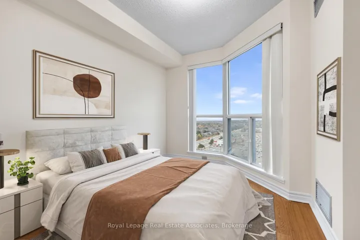 Bright & spacious 2 bedroom, 2 bath corner unit with over 1200 sq.ft in the prestigious gated community of Eagle Ridge! Panoramic views of downtown and the lake with an abundance of natural light that streams through the many windows of this home. Open concept living/dining area. The kitchen includes an eating area & breakfast bar. Desirable split bedroom design with the primary bedroom featuring a 4 pc. ensuite with a separate tub & shower as well as large walk-in closet. This unit includes 2 owned parking spots & one locker! Fantastic amenities with a private clubhouse including an indoor pool, hot tub, exercise room, sauna, squash courts, BBQ area & playground. Enjoy peace of mind with 24 hour security. Maintenance fees also include heat, hydro, water, internet & cable! Hassle free living! Convenient location & steps to transit & shopping at South Common Mall. Close to Credit Valley Hospital, schools, UTM Mississauga campus, Erindale & Clarkson Go Stations.