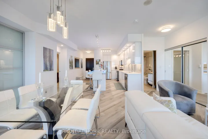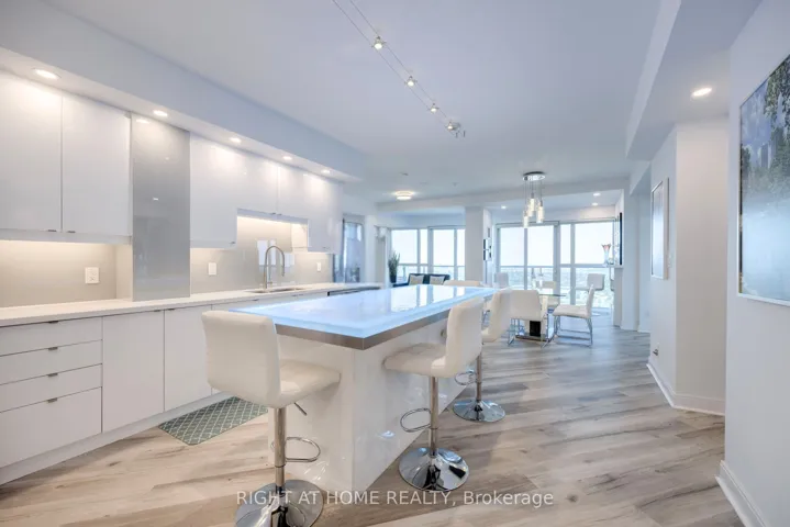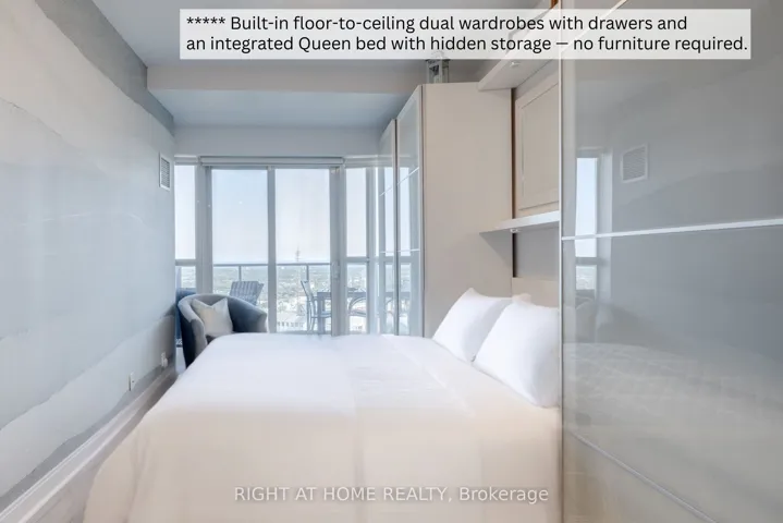 VIEW: This fully renovated 1,105 sq. ft. contemporary residence offers panoramic, unobstructed views of the CN Tower and Lake Ontario, framed by floor-to-ceiling windows and a 225 sq. ft. wrap-around terrace. Southeast exposure delivers stunning sunrises and exceptional natural light throughout the day. KITCHEN: Designed for modern living and entertaining, the custom kitchen features over 30 high-gloss cabinets, a custom tinted glass backsplash, and a striking 8-foot island with an LED-lit glass countertop. BATHS: Both bathrooms have been fully renovated with high-end finishes for a cohesive, move-in-ready experience. PRIMARY SUITE (INTEGRATED STORAGE – NO EXTRA FURNITURE REQUIRED): The primary bedroom is intelligently designed with built-in floor-to-ceiling dual wardrobes with drawers and an integrated queen bed with hidden storage (hydraulic lift), eliminating the need for bulky dressers. The bed platform and wardrobes are included-just bring your Queen mattress. SECOND BEDROOM/HOME OFFICE: Comfortably accommodates a queen-size bed and dresser, featuring an oversized closet and direct access to the balcony. SMART TECH: Fully integrated smart home features with voice-controlled lighting throughout the main living areas let you set the ambiance effortlessly. PARKING & STORAGE: Includes TWO premium parking spaces and a large storage locker, a rare offering in this location. AMENITIES: Resort-style amenities include a fitness centre, indoor/outdoor pools, pickleball, basketball and squash courts, and 24-hour concierge. LIFESTYLE: Located at Mississauga’s most iconic address, just steps to Square One, dining, transit, and the upcoming LRT. KEY UPGRADES: Integrated primary suite storage, 8-foot island with LED-lit glass countertop, smart lighting, two parking spaces. Don’t miss out on checking the building website: https://60absolute.ca/