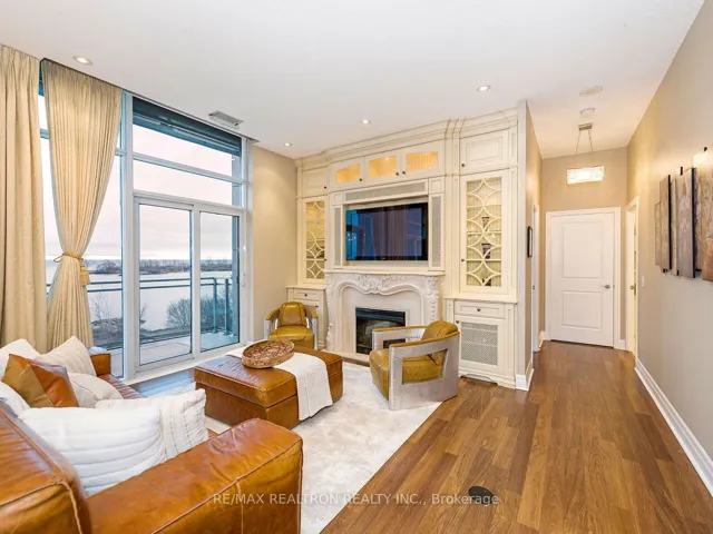 This truly one-of-a-kind residence presents an exceptional opportunity to own one of the finest waterfront condos available. Offering 2 bedrooms and 2 bathrooms, this expansive suite is nestled within a low-rise building at the water’s edge, featuring breathtaking lake and CN Tower views from every room-an incredibly rare offering in the neighbourhood. Positioned on the top floor of the podium, the unit provides the added luxury of no neighbours above. Soaring 10-foot ceilings amplify the generous 1,275 sq ft of living space, complemented by a private balcony with a powered awning-perfect for relaxing on sunny days. The kitchen has been extensively upgraded with premium appliances, thick granite countertops, and a built-in wine cooler-ideal for both everyday living and entertaining. The grand primary suite is a true retreat, showcasing floor-to-ceiling windows and a spa-inspired 5-piece ensuite complete with a Jacuzzi tub and separate shower. Thoughtfully designed with custom built-ins throughout, this home offers a seamless transition for downsizers. Highlights include a built-in office and optional Murphy bed in the second bedroom, three custom shelving units, and a fireplace anchoring the living and dining areas. A walk-in pantry with a dedicated freezer adds both convenience and functionality. Quietly situated away from the noise of the Gardiner and nearby restaurant patios, this residence offers a peaceful living environment without compromising on location. A rare offering not to be missed.