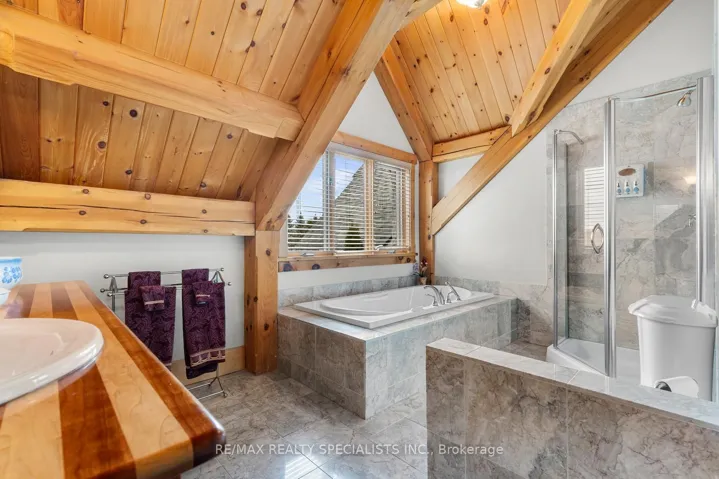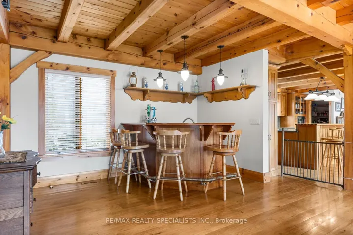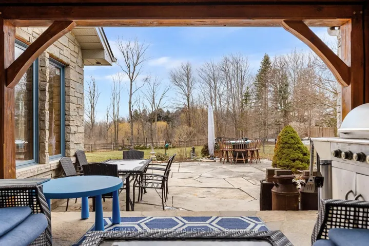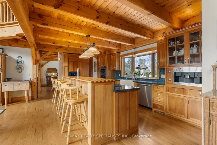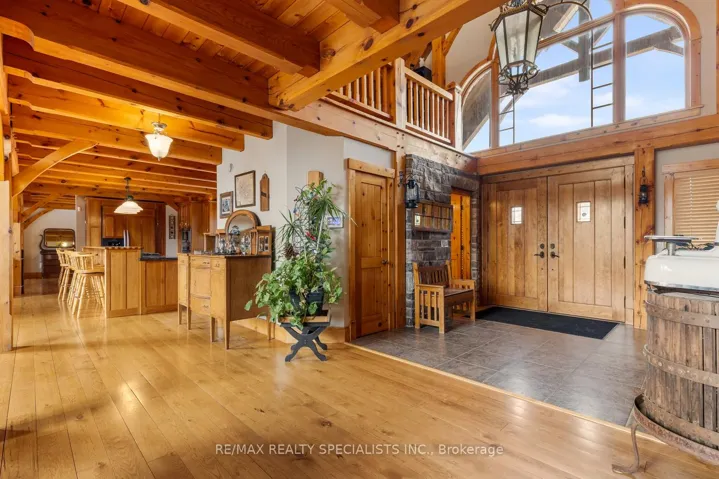 Set on a scenic 3.2-acre lot in Milton, this custom-built Canadian post and beam home offersthe perfect blend of luxury and natural beauty. Located on Trafalgar Road, just across from Piper’s Heath Golf Club, the property backs onto a peaceful river and features a secondlower patio right at the shoreline.With approximately 5,900 sq ft of living space, the home showcases soaring 26-foot ceilingsin the main living and dining area, custom hardwood floors throughout, and expansivewindows overlooking the backyard. A striking stone fireplace anchors the living room andextends into the basement, adding warmth and character across both levels.The kitchen is designed for both function and entertaining, featuring a gas cooktop, largeisland, and pantry. Just off the kitchen, a separate entertainment room filled with skylightsand natural light provides the perfect space to host, with access to a covered backyard patiocomplete with a sink for outdoor cooking or gardening.The main floor primary suite includes two closets, a 5-piece ensuite, and direct backyardaccess. Upstairs, you’ll find three spacious bedrooms, each complete with its own privateensuite-ideal for family living or accommodating guests in comfort and privacy.The basement offers a spacious recreation area and additional bedroom potential, ready tobe customized to your needs. A 6-car garage with a large loft, parking for 11 vehicles, and abuilt-in security system complete this exceptional custom family home.