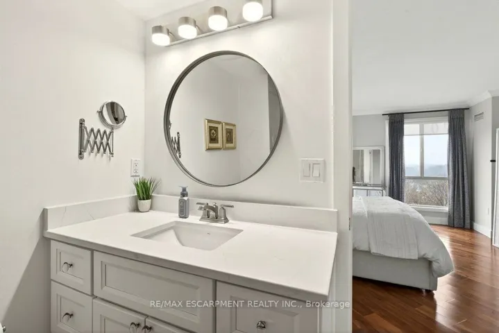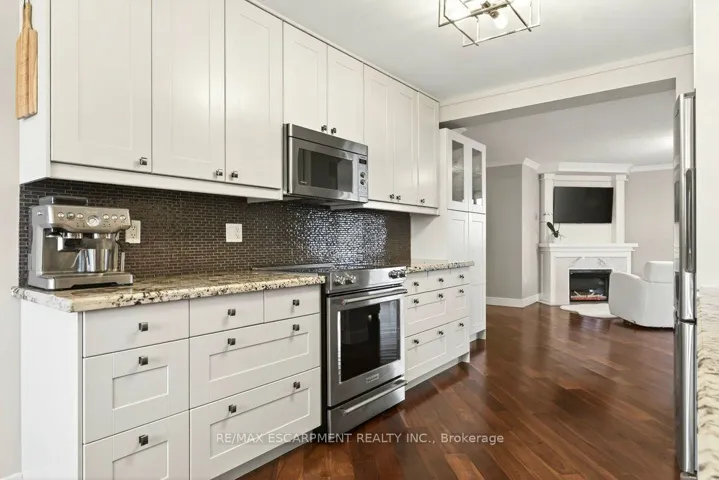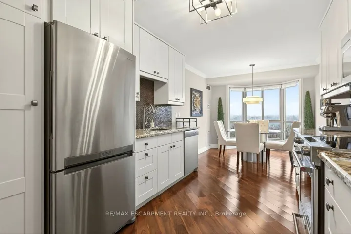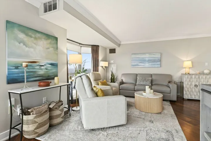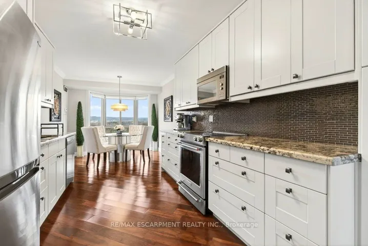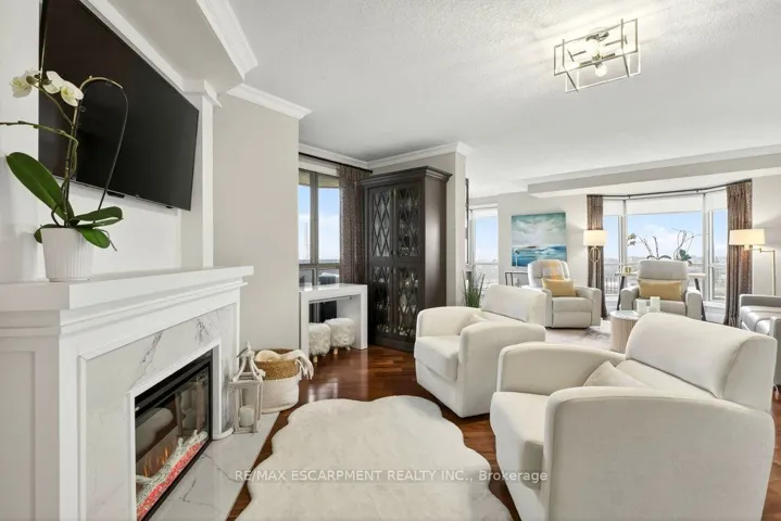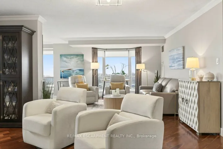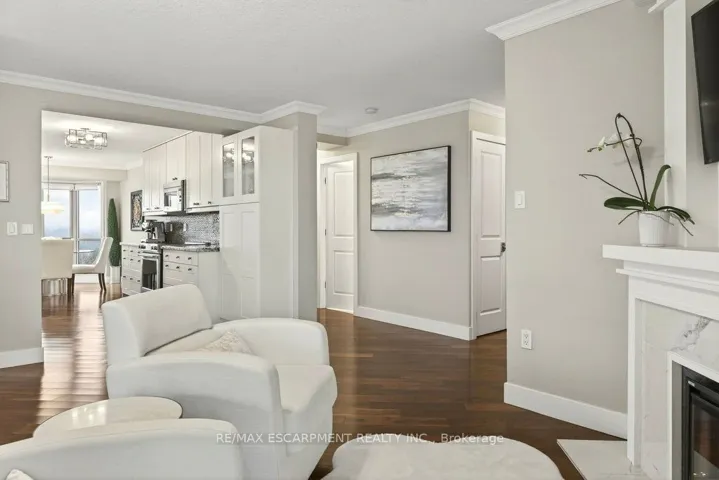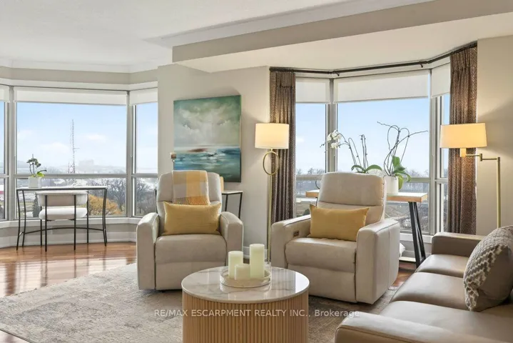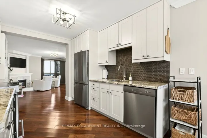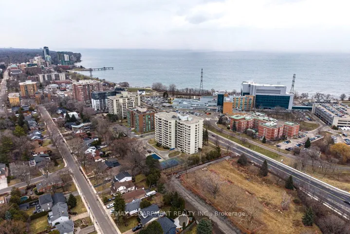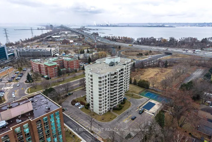 Beautifully updated 2 bedroom corner suite at ‘Lake Winds’ in prime downtown core location! Just steps to the lake, waterfront park, restaurants, shops, hospital and highway access. 1,532 sq.ft. loaded with natural light featuring southwest exposure and gorgeous views of the lake, bay, bridge, escarpment and beyond! Upgraded eat-in kitchen with granite, stainless steel appliances, glass subway tile backsplash and pantries for extra storage. The primary bedroom features a 4-piece ensuite with soaker tub and custom closet, while the second bedroom is highlighted by a large built-in wardrobe and easy access to an updated 3-piece bathroom with oversized walk-in glass shower. Open living/dining area exudes sophistication with rich engineered hardwood floors, crown moulding, bay windows, electric fireplace, custom window coverings, modern light fixtures, walkout to a private balcony and access to a spacious in-suite laundry with built-in cabinetry. Building amenities include a heated outdoor pool, tennis court, sauna, fitness centre, car wash bay, social room, bicycle storage, workshop and ample visitor parking. Traffic light located at building entrance for safe and easy entering and exiting. 2 underground parking spaces and 1 storage locker. Condo fee includes all utilities.