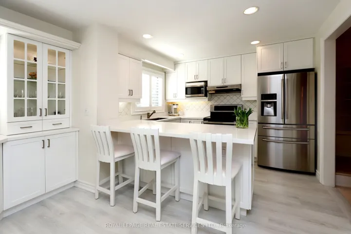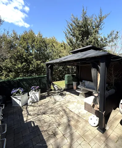 Welcome to this gorgeously renovated 3 Bdrm, 3 Bath End-Unit Townhome in the highly sought-after, family-friendly community of Rockwood Village, ideally located at the Etobicoke/Mississauga border. Situated in a small well-managed complex, this spacious multi-level home lives more like a semi-detached. Tucked away at the end of the lane location, adjacent to greenspace, it offers a lovely private backyard location – a peaceful setting that is hard to find. Lovingly maintained by proud long-standing residents, this home has been meticulously renovated from top to bottom. The large eat-in kitchen features an abundance of cabinetry with elegant glass accents & pantry, stainless steel appliances, and beautiful quartz countertops – perfect for both everyday living and entertaining. The lovely formal Dining Area overlooks a bright and spacious Living Room with soaring cathedral ceilings and a stunning floor-to-ceiling marble gas fireplace. Step out from the living room through your French Doors to your private backyard patio complete with gazebo and evening lighting – an ideal spot to relax or entertain. Throughout the home you’ll find beautiful white oak hardwood flooring, California shutters adorning every room, crown moulding accents, and upgraded handrails & pickets. The ground level offers the rare convenience of the laundry room with an additional 3-piece bath, along with a cozy lower-level family room for that extra space. The basement level has been thoughtfully repurposed to provide ample additional storage space. This unbeatable location offers easy access to parks, schools, shopping, public transit, and major highways, while still being within convenient reach of downtown Toronto. This turnkey home is a true gem in a fantastic neighbourhood – don’t miss your chance to call it home!