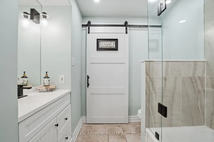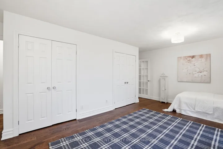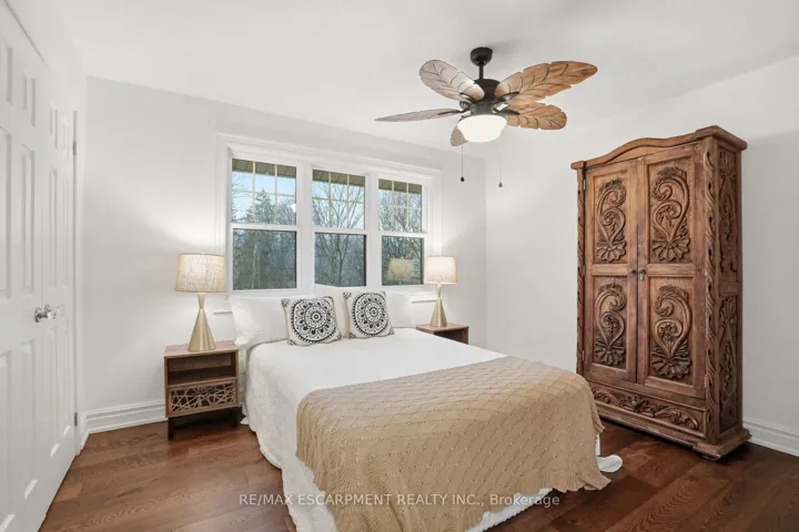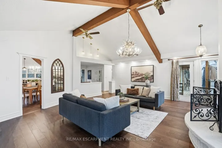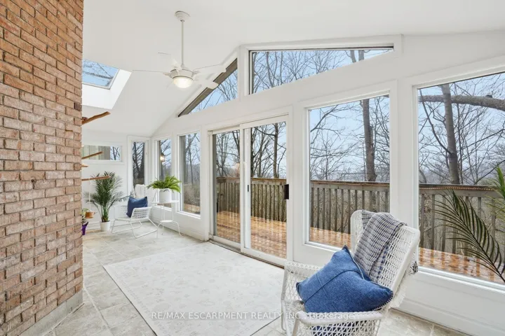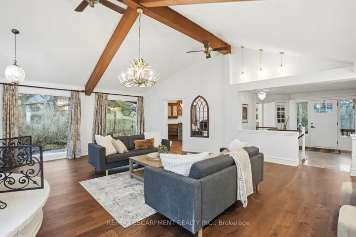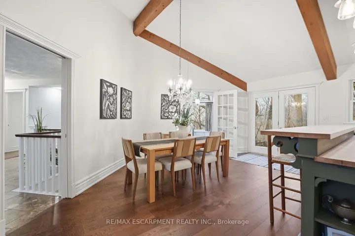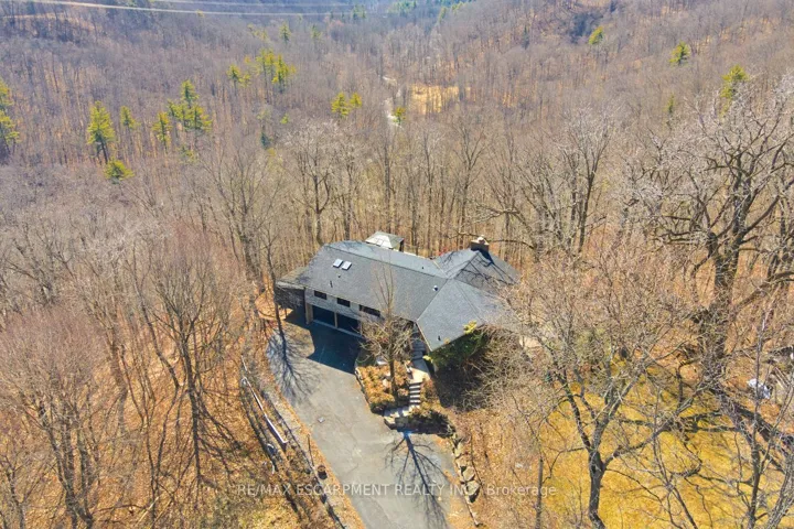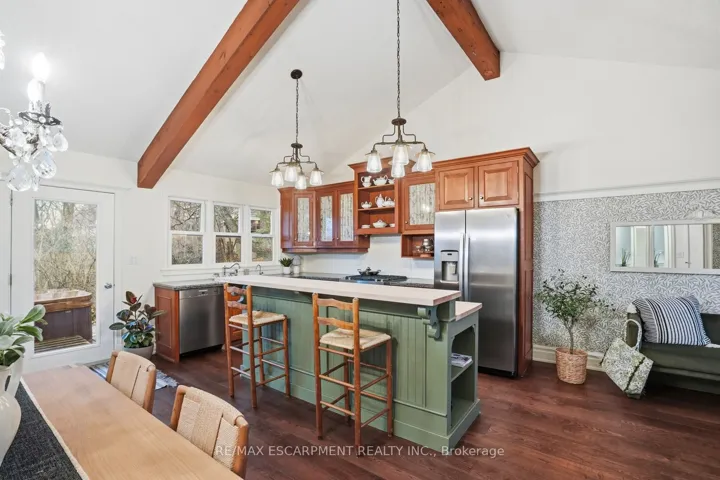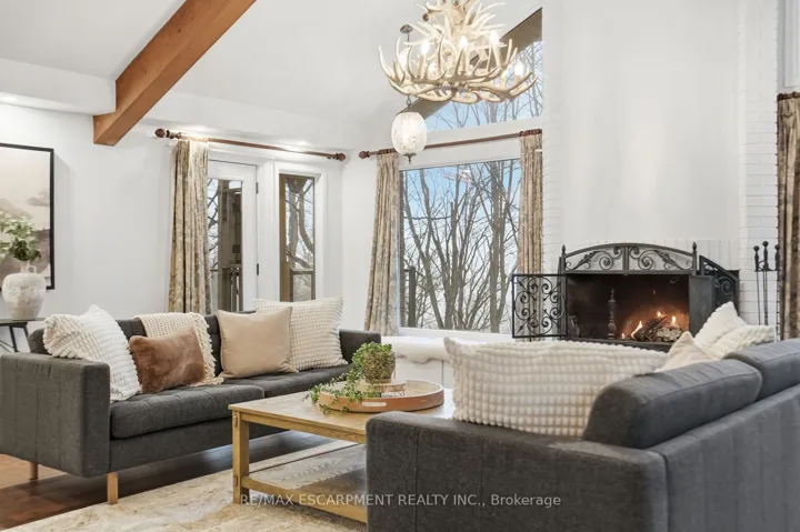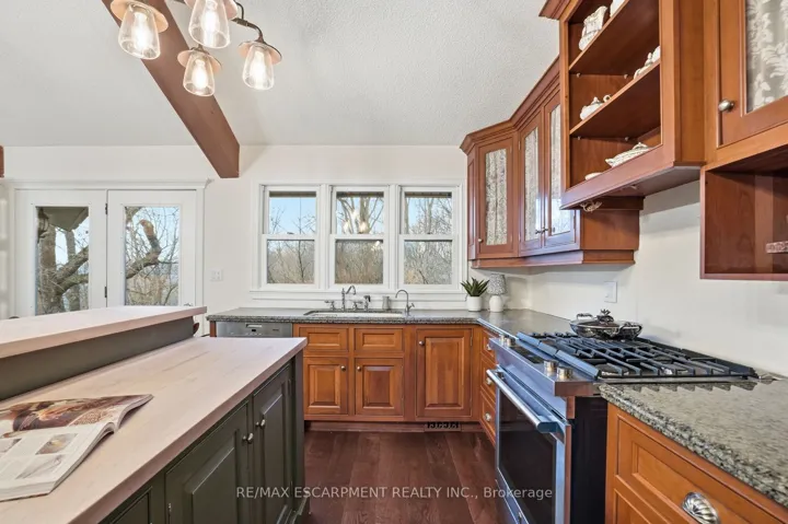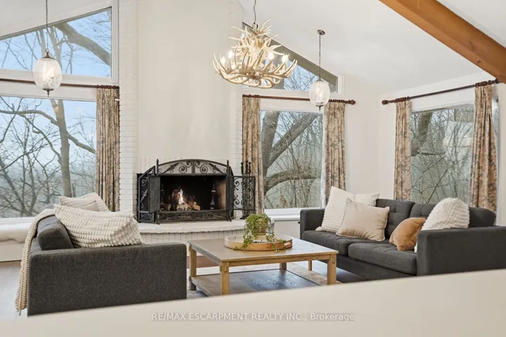 Tucked away on a picturesque 1-acre lot backing onto Grindstone Creek, this beautifully renovated raised bungalow offers the ultimate in privacy, tranquility, and multi-generational living. Surrounded by mature trees and natural beauty, this truly one of a kind offering delivers peaceful, country-style living just minutes from city amenities. The main level features three spacious bedrooms, including a serene primary retreat with a private ensuite and walk-out to the primary level deck. Set high in the Carolinian tree canopy, this large outdoor space is perfect for morning coffee, entertaining, or unwinding at sunset. The bright, airy living room is highlighted by vaulted ceilings, expansive windows that flood the space with natural light, and a cozy, raised hearth fireplace as its focal point. The custom made, cherry wood eat-in kitchen blends function and style, showcasing stainless steel appliances, granite countertops, and ample cabinetry-ideal for both everyday living and entertaining. The fully finished walkout basement offers excellent versatility with a self-contained in-law suite featuring a separate entrance, one bedroom, a full bathroom, dedicated laundry, a large great room with gas woodstove, and a bonus three season sunroom leading to a private outdoor deck-perfect for extended family, guests, or potential rental income. This exceptional property offers a unique lifestyle opportunity in one of Burlington’s most desirable and undiscovered settings. RSA.