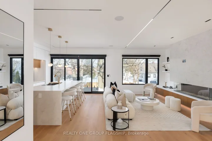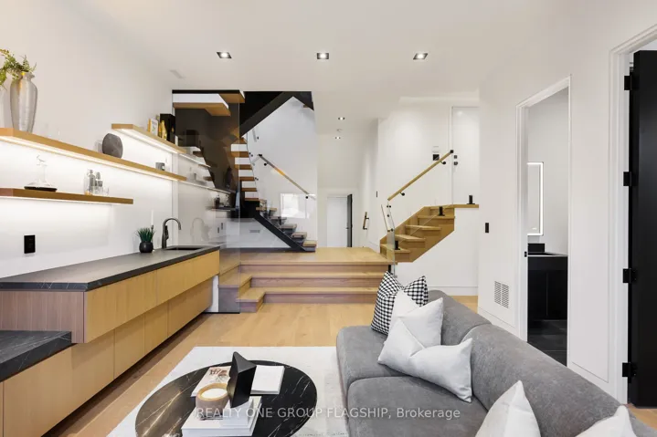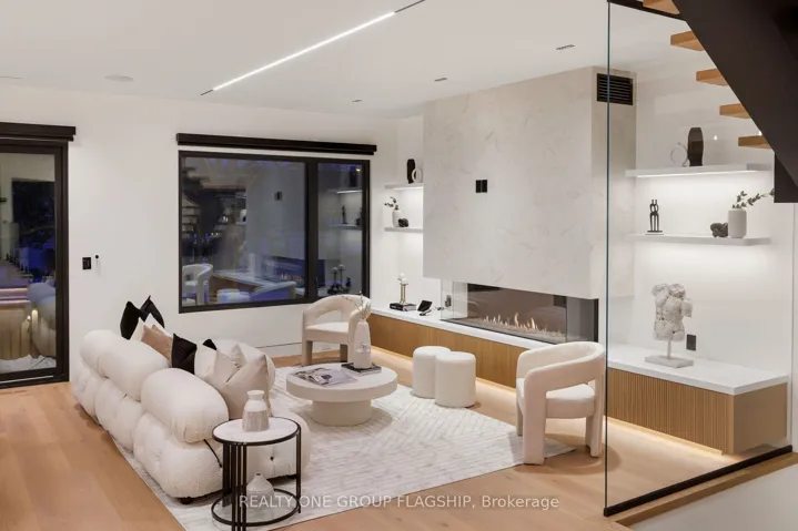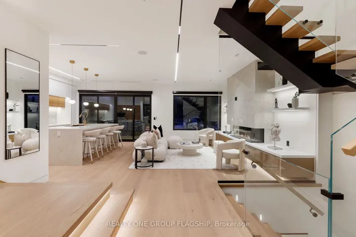 A commanding architectural statement in prestigious Stonegate-Queensway, this newly completed custom residence is thoughtfully crafted by an HCRA-licensed builder and backed by the full Tarion Warranty. Offering approx 3,650 sq ft of curated living space with 4+1 beds & 5+1 baths, the home is defined by architectural clarity, material integrity & refined restraint. A dramatic 14-ft foyer introduces interiors where soaring ceilings, wide-plank white oak floors, bespoke millwork & a fully trimless shadow-reveal design create crisp, uninterrupted lines and a gallery-like atmosphere, enhanced by layered architectural lighting throughout. A sculptural floating mono-beam staircase wrapped in ultra-clear glass rises as a striking focal point, while a porcelain feature wall with a 3-sided fireplace anchors the principal living space with warmth & presence. The chef’s kitchen showcases a waterfall porcelain island, handcrafted fluted cabinetry & a professional Sub-Zero & Wolf appliance suite seamlessly integrated into the design. Expansive walls of glass & 9 skylights draw natural light across every level, complementing curated interior illumination and heightening the home’s sense of scale and calm. Integrated Control4 automation provides effortless control of lighting, audio, security & motorized window coverings. Upstairs, the primary retreat offers boutique-hotel serenity with custom millwork, a generous walk-in closet & a spa-inspired ensuite finished in rich porcelain & refined fixtures, while each add’l bedroom enjoys ensuite access. The bright walk-up lower level continues the architectural narrative with 10-ft ceilings, a bespoke wet bar, rec lounge, add’l bedroom & full bath. A bold contemporary façade defined by aluminum panel detailing, precision fluted elements & architectural exterior lighting, complemented by professional landscaping, completes this architecturally refined modern residence mins to top schools, waterfront trails, Mimico GO & downtown Toronto.