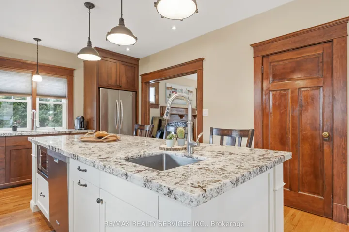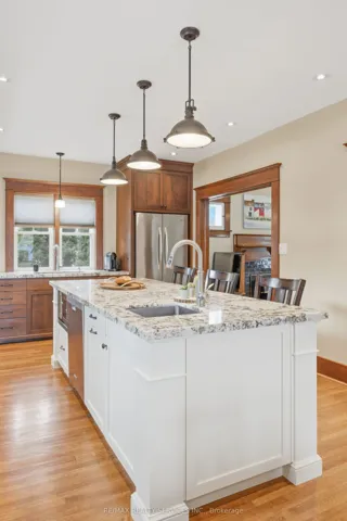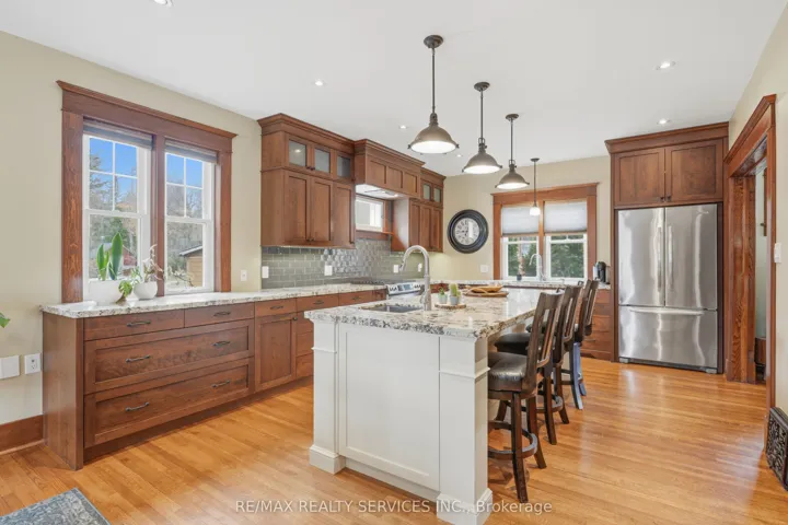 The gorgeous Century Home has it all! Tucked away in a pocket of Caledon East downtown and it’s amenities, this home has been lovingly maintained and updated through the years! Only 4 owners for this special girl, as whoever comes to live here, doesn’t want to leave! This is your opportunity to live with old world character, and all the comforts of a newer home! The covered front porch welcomes you to sit and relax – upon entering the home’s large foyer, you’re greeted with hardwood flooring and a large closet, high ceilings and entry to the massive renovated kitchen! The custom built kitchen was designed with the original details in mind, blending two-toned cabinetry, a huge island with granite counters, pot lights & tons of built-ins, all relating back to the original trim. A walk-in pantry offers even more storage! The formal living room js cozy with a gas fireplace, quality windows & hardwood floors. Beyond the kitchen is a large mud/laundry room with an up to date 3 pc bathroom and a patio door walk-out to a large deck, extending your indoor-outdoor living. The upper level boasts hardwood floors and 4 spacious bedrooms, with the Primary suite offering a big L-shaped walk-in closet, consisting of two clothing areas, built-in cabinets and a long vanity & windows for natural light! The 3rd bedroom has a rough-in for a 3rd bathroom (under the carpet). Nicely updated 4 pc bathroom. One more level up is a massive attic space with windows, just waiting for your imagination and ideas! The lower level has a large finished rec room with quality LVP flooring, a large window & pot lights; furnace room and large storage area, & a 2nd storage space under the laundry room.The lot here is spectacular, with gorgeous gardens, mature trees and backs onto a farm field. A large double workshop/garage tops the list, with two full garage doors with openers, a separate man door and a huge loft, perfect for entertaining or a perfect man cave!