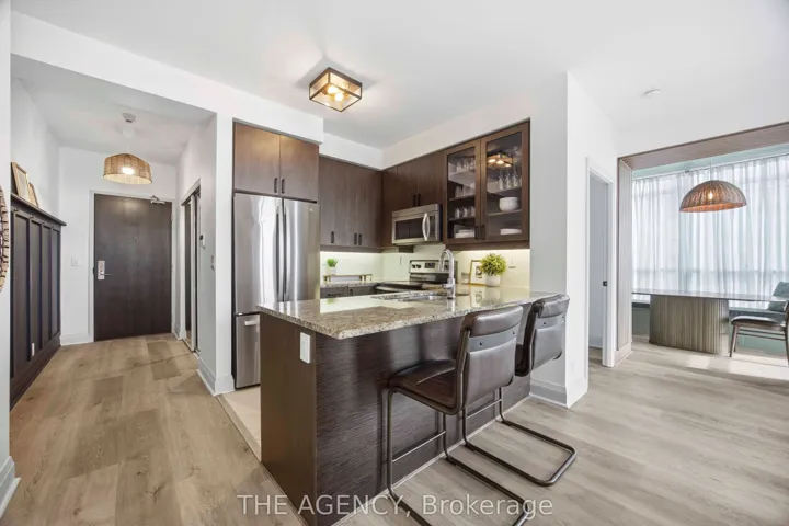 This beautifully updated suite is located in one of Etobicoke’s most rapidly evolving communities. Offering strong long-term growth potential and an unbeatable lifestyle for young professionals and commuters. Featuring updated flooring, smooth ceilings, fresh paint throughout, and modern light fixtures, this unit is completely move-in ready. The fantastic layout is both functional and inviting, highlighted by a custom built-in dining area with bench seating for 8, perfect for hosting. Enjoy tranquil views overlooking Lake Ontario, with a park just steps away, ideal for dog lovers and outdoor enthusiasts. The desirable corner unit with southwest exposure fills the space with natural light and offers stunning evening sunsets. Designed with convenience in mind, this location is ideal for commuters with seamless access to transit and highways. TTC is right at your doorstep, and you’re just minutes from the Gardiner Expressway for an easy downtown commute. Plus, Toronto Pearson Airport is only 10 km away, perfect for frequent travelers. Walk to groceries, restaurants, and entertainment, all while being surrounded by green space in a fast-growing, high-demand neighborhood. A perfect blend of style, comfort, and convenience. This is urban living at its best. Residents enjoy exceptional building amenities, including an indoor pool, sauna, hot tub, fully equipped gym, rooftop terrace with BBQs, party room, guest suites, visitor parking, pet wash, car wash station, and 24-hour concierge.