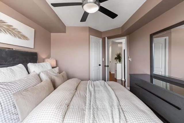 Stunning 1+1 condo in the sought-after Village Terraces, showcasing a bright, carpet-free interior with unobstructed southeast views overlooking tranquil green space. Finished in neutral tones, this sun-filled suite offers a functional open-concept layout, ideal for comfortable everyday living, all tucked away on a quiet cul-de-sac in a family-friendly neighbourhood. The updated kitchen is complete with stainless steel appliances, a reverse osmosis water filtration system, and a convenient breakfast bar, seamlessly connecting to the generous dining and living areas. Step out onto a large private balcony with a natural gas hookup-perfect for outdoor dining or relaxing in the sun. Modern 4 pc bathroom has been tastefully updated. The spacious king-size primary bedroom features a walk-in closet and beautiful southeast views. A versatile den provides the flexibility to be used as a second bedroom, home office or workout space. Enjoy a well-maintained building offering 24-hour concierge service, fitness centre, sauna, party/meeting room, workshop, library, car wash and ample visitor parking. Unbeatable location! Just minutes from Port Credit Village, Lake Ontario waterfront trails and marina, restaurants, shops, excellent schools and Sherway Gardens. Easy access to Port Credit and Long Branch GO, QEW and 427.Additional features include in-suite laundry for everyday convenience, an exclusive locker and separate access to bike storage room at no additional cost. The unit also offers an extra wide parking spot with no adjacent vehicle – spot is equipped for larger vehicles. This unit has lower maintenance fees compared to other similar units in the building-providing exceptional value.