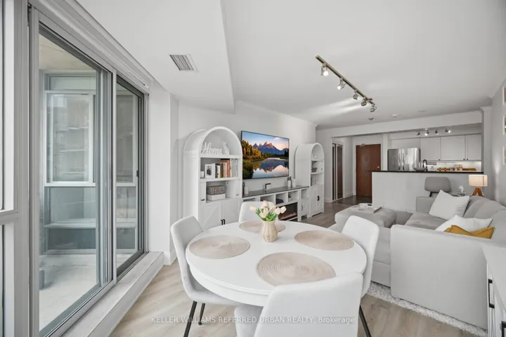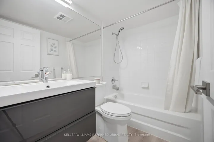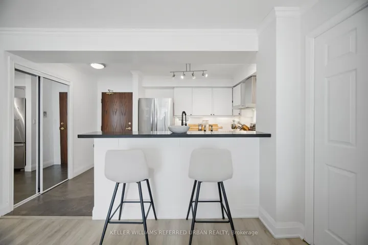 This bright and spacious split two-bedroom, two-bathroom suite offers a thoughtfully designed floor plan in a boutique-style building. Recently updated, the unit showcases quality finishes including luxury vinyl plank flooring, ceramic tile, and a fresh, modern palette. The contemporary kitchen is both stylish and functional, featuring stone counters, a classic subway tile backsplash, two-tone cabinetry, full-size quality appliances, and an extended breakfast bar that seamlessly connects to the open-concept living and dining area. The generous primary bedroom serves as a private retreat, complete with a beautifully updated ensuite featuring a soaker tub, glass-enclosed tiled shower, modern vanity, and updated flooring, along with an expansive custom walk-in closet. Enjoy your morning coffee or unwind at the end of the day on the private balcony, with tranquil views of the sunrise over the lake. Ideally located just steps to the waterfront, Humber Bay, scenic walking and cycling trails, and Grand Avenue Park. Commuting is effortless with nearby transit options, including Mimico GO Station and Royal York Station, plus quick access to the Gardiner Expressway and Highway 427, connecting you easily to downtown Toronto and the airport. A fantastic opportunity to own a turnkey suite in one of Mimico’s most desirable pockets.