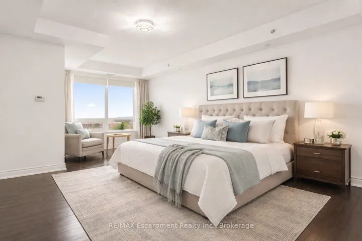 Elevate your lifestyle to unprecedented heights in this exquisite penthouse sanctuary, where sophisticated urban living meets breathtaking natural splendor. This remarkable three-bedroom, three-and-a-half-bathroom residence spans an impressive 2,708 square feet of meticulously crafted living space, designed for the most discerning homeowner. The southwest-facing orientation bathes the interior in golden light while showcasing panoramic vistas of the majestic escarpment and the endless expanse of Lake Ontario. The open-concept kitchen, adorned with lustrous new porcelain tile, features a striking island that serves as the culinary centerpiece, seamlessly connecting to the breakfast nook and intimate sitting area-a perfect orchestration of form and function. The thoughtfully designed split floor plan ensures privacy, with the primary bedroom suite positioned away from guest accommodations. Guest suites boast their own private ensuite and generous walk-in closets, creating a personal retreat. Throughout the residence, rich hardwood flooring adds warmth and timeless elegance. Step onto the spectacular wrap-around balcony accessible through multiple walkouts, complete with a BBQ gas line for personal grilling. The building exemplifies luxury living with resort-style amenities including a sparkling pool, tranquil sitting areas, fully equipped fitness center, rejuvenating whirlpool, sophisticated social lounge, and convenient guest suite. This penthouse represents the pinnacle of Oakville living, where every sunrise and sunset promises new possibilities.