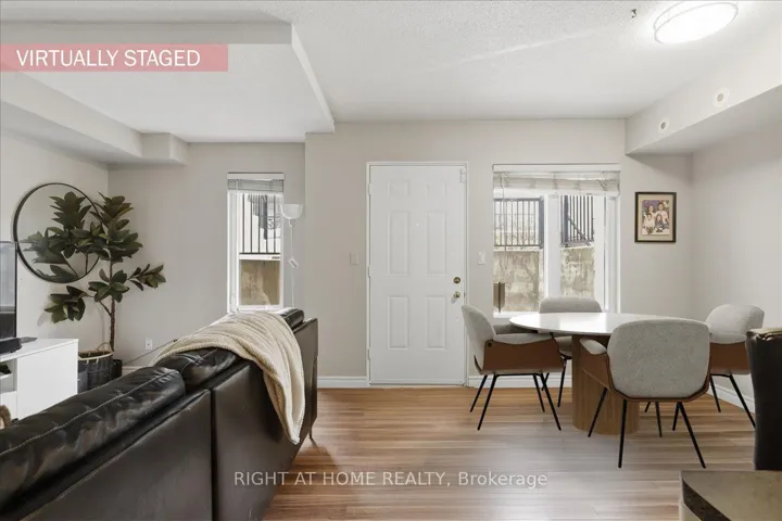 2 Bdrm + Den Townhouse In Harmony Village. Convenient Location, Well Maintained, Corner Unit W/ Front & Back Patios. Upgraded Kitchen Cabinets W/ Backsplash & Breakfast Bar. Close To School, Park, Plaza, & Other Amenities. Steps To Public transit TTC & Finch West LRT, Min To Hwys 427 & 400.