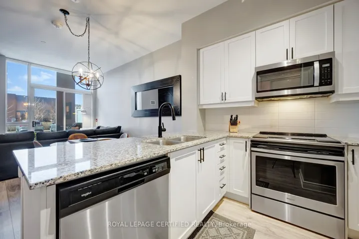 Welcome to the Prestigious Art on Main, where luxury meets lifestyle in this amazing layout of 744 square foot ground-floor residence. This home has a rare privilege of direct outdoor access with a private large walkout patio having a gas hook for your very own BBQ unlike other units. A great addition for dining and entertaining. Carpet free throughout, 10-foot ceilings and floor-to-ceiling south-facing windows with discreet privacy film bathe the space in natural light, complementing the beautiful open-concept design. The king-sized primary bedroom with a spacious layout. The enclosed den ideal as a second bedroom or executive home office. A chef inspired kitchen features quartz countertops, premium stainless-steel appliances. Custom-built dry bar with a stunning walnut waterfall counter and built-in beverage chiller. Upgrades include in-suite laundry, designer lighting, and a spa-like 4-piece bathroom. High end executive style amenities, including a pet spa, guest suites, heated outdoor pool, steam room, state-of-the-art fitness centre, rooftop terrace, library, events room with chef’s kitchen, party lounge, games room, and ample visitor parking. Perfectly positioned across from the Milton Public Library and mere minutes from the GO Station, top-rated schools, parks, boutique shops, restaurants, hospital, and major highways. This exquisite suite offers an a blend of convenience, comfort, and contemporary luxury that you don’t want to miss !