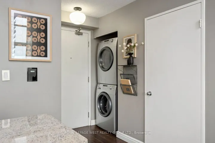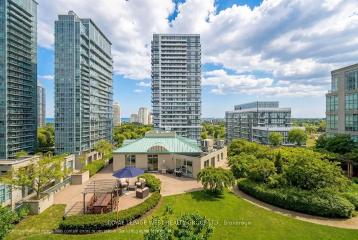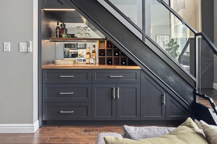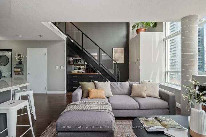 Rarely offered two-storey, south-facing loft at Mystic Pointe, showcasing serene views of lush greenery and the lake, and no signs of the highway. Sun-filled throughout the day, this bright, open-concept space offers just under 1,000 sq.ft. of well-designed living. Soaring 17 ft ceilings and expansive windows create a dramatic, airy living area, perfect for both relaxing and entertaining. The open kitchen features granite countertops and a breakfast bar that seamlessly connects to the living space, making hosting effortless. A custom bar area with built-in storage tucked beneath the stairs adds both function and style. The main level includes a convenient powder room, while the upper level offers a spacious bedroom, 4-piece bathroom, a walk-in closet with built-ins for extra storage, and a versatile den ideal for a home office, nursery, or guest space. Situated in the heart of Park Lawn & Lake Shore, steps to the waterfront, parks, trails, and everyday amenities. This location offers a perfect balance of urban convenience and lakeside calm living.