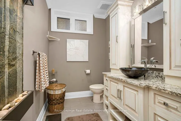 Welcome to 46 Scott Street a truly exceptional custom bungalow designed with care, craftsmanship, and every detail thoughtfully considered. The open-concept main floor features a stunning chefs kitchen with granite island, double sink, two ovens, 5-burner gas range, pasta pot filler, water filtration, pot lights, built-in speakers, and wine fridge all flowing into a spacious great room with 12′ ceilings, stone gas fireplace, surround sound, and custom blinds. The dining area opens directly to your private backyard oasis. The primary suite is a true retreat with a luxurious 5-piece ensuite: Jacuzzi tub, large shower with rain head and body sprays, crystal chandelier, electric fireplace, walk-in closet, and custom built-ins. A generous office, second bedroom, and large laundry room with sink, stone backsplash, folding table, and ample storage complete the main floor. Enjoy the quiet of solid 8′ soundproof doors and 10″ walls throughout. The fully finished basement features 9′ ceilings, heated floors, custom oak kitchen with Corian island, top-quality appliances, rec room with two-sided stone gas fireplace, games area, two large bedrooms, and a spa-like 3-piece bathroom with steam sauna, rain shower, body sprays, and light-up wall fountain. Also includes 2 soundproof studio rooms and 2 cold storage areas. The oversized garage is ideal for car enthusiasts, offering lift height, custom shelving, inside access, two garage door openers, and finished walls. The backyard offers privacy with mature trees, irrigation system, 12×12 gazebo, gas BBQ hookup, shed, covered porch, and a peaceful stone waterfall. Additional features: 2×6 construction, stone and brick exterior, high-efficiency furnace, RO system, water softener, on-demand water heater with backup tank, security system, dimmable lighting, two staircases, and expansive windows overlooking landscaped gardens. This one-of-a-kind home is a must-see built with top-tier quality, comfort, and timeless style.