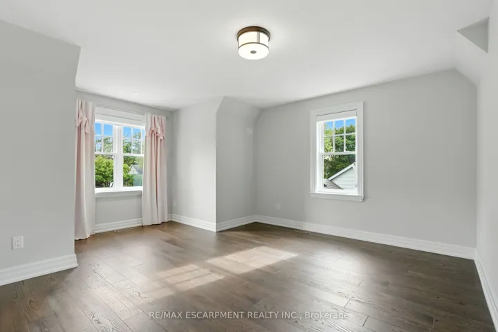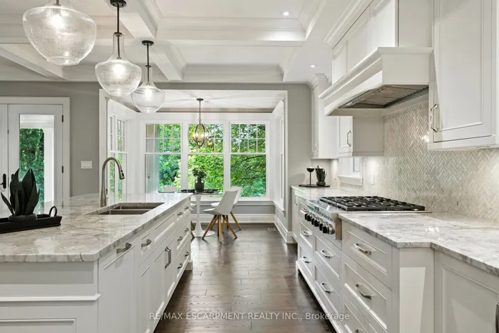 Custom-built in 2016 by M. Butler Custom Homes, this exceptional residence offers approximately 5,000 square feet of luxurious living space, showcasing premium finishes and superior craftsmanship throughout. Situated on a 217-ft deep, pool-sized lot backing onto the RBG Hendrie Valley Sanctuary, this home blends elegance with natural serenity. The gourmet kitchen features a large island with dual-sided cabinetry, sink and pendant lighting, along with built-in stainless steel appliances including a wall oven, gas cooktop, fridge and dishwasher plus a sunlit eat-in area overlooking the private backyard. Rich hardwood flooring spans the main and second levels, complemented by hardwood stairs, coffered ceilings, crown moulding and pot lights that add warmth and architectural detail. The private primary suite includes a luxurious spa-like ensuite and two walk-in closets with custom built-ins. A finished walk-out lower level adds flexible living space, offering a fifth bedroom, full bathroom, rec room and multi-use area perfect for an office, gym, craft room or playroom. An upper-level balcony off the great room extends the living space outdoors and features a gas BBQ hook-up. Additional highlights include oversized windows, engineered hardwood, central vacuum and full home pre-wiring for automation and audio/video distribution. Ideally located minutes from Aldershot GO Station, Highways 403 and 407, as well as nearby restaurants and shopping. RSA. Luxury Certified.