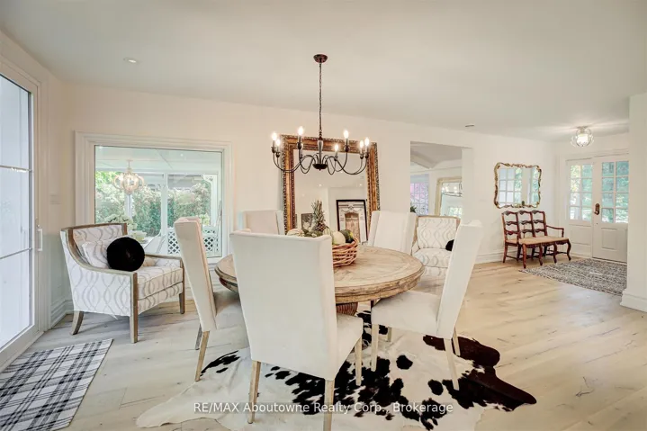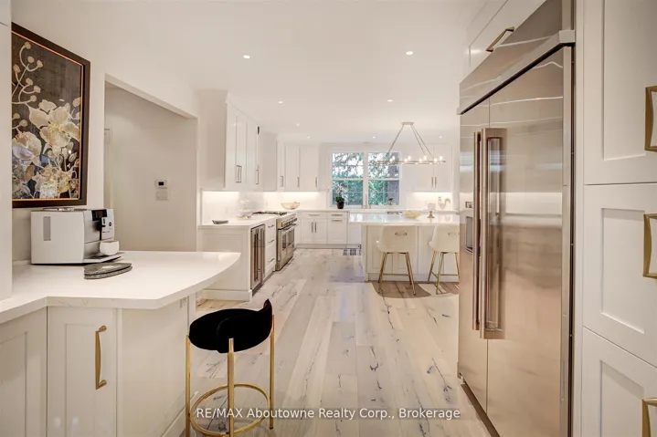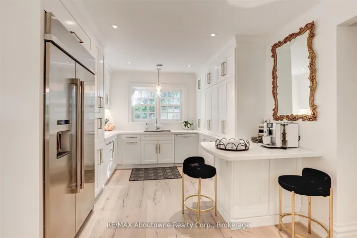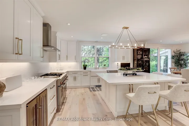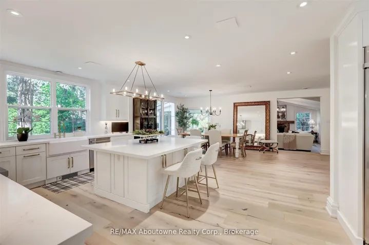 Transitional Elegance in the Heart of Olde Oakville. A rare property on one of the community’s most coveted streets. Experience refined living in this exceptional residence- set on a triple lot over 1/2 acres with an impressive 154.73 ft frontage, curated for those who value privacy, design and indoor-outdoor living at its finest. Beautifully reimagined in 2024, the main level showcases a sophisticated blend of transitional elegance and casual upscale comfort, perfect for both everyday living and effortless entertaining. A Main Floor Redesigned for Modern Luxury. Step inside to wide-plank oak hardwood floors, luxurious finishes, and stunning sightlines to the property’s park-like grounds. The brand-new designer kitchen is a true showpiece, featuring: Main kitchen+ second “messy kitchen” for concealed prep, storage, and small appliances. Silk granite farmhouse sink with brushed gold gooseneck faucet and gold hardware accents throughout- Oversized picture window overlooking the gardens. Square island with integrated fridge/freezer drawers. Quartz countertops & full-height backsplash in both kitchens. Built-in wine/beverage station. Dedicated coffee bar. A walk-out from the dining room and a large picture window open to views of the serene screened-in sun porch, creating a seamless flow for indoor-outdoor enjoyment. The magnificent great room features dramatic cathedral ceilings, a stone wood-burning fireplace (forced-air assist) with aged beam mantel, and wiring/rough-ins for a full theatre- quality sound system. A second walk-out continues to the sun porch- offering year-round enjoyment framed by nature. Flexible living spaces: Third floor loft/suite ideal for guests, teens, studio or office.4+1 bedrooms, 4 bathrooms, and over 5200 sq ft of total finished living space. Finished basement with heated floors in media room (or current gym). Dust-free heat system with individually controlled room zones. **Remarks continued in Attachments