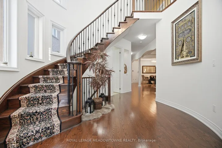 Absolutely stunning executive estate home positioned on the most exclusive and finest street in Churchill Meadows, quietly nestled on a prestigious cul-de-sac offering unmatched privacy and distinction. This meticulously maintained residence showcases a rare three-car driveway and two-car garage equipped with an EV charger, soaring ten-foot ceilings on the main level, nine-foot ceilings on the second level, and a professionally finished walk-out basement designed for elevated living. The home features four full bathrooms plus a powder room, smooth ceilings throughout, and convenient upper-level laundry with brand new machines. The chef’s kitchen is crafted for luxury entertaining, featuring smart Samsung appliances under warranty, an elegant breakfast area with walk-out to a two-tier deck, and a gas hookup for seamless indoor-outdoor hosting. The grand primary retreat boasts a fireplace, two expansive walk-in closets, and a spa-inspired five-piece ensuite designed for ultimate relaxation. Secondary bedrooms are equally impressive, offering a Jack and Jill five-piece bath and a private ensuite suite complete with walk-in closet and three-piece bathroom. California shutters throughout provide timeless elegance and refined privacy. The lower level unveils a newly built apartment-style living space finished to an exceptional standard, highlighted by a massive home theatre, two executive offices, and direct walk-out access to the landscaped yard – ideal for extended family, guests, or sophisticated entertaining. A rare opportunity to acquire a grand, impeccably appointed luxury residence on the most coveted street in one of Mississauga’s most sought-after communities.