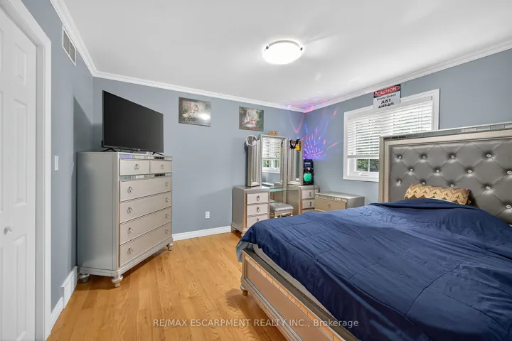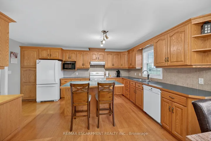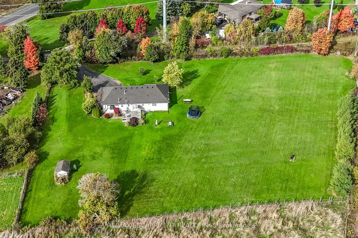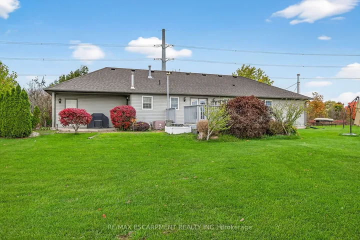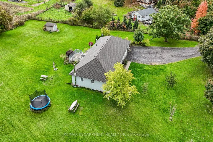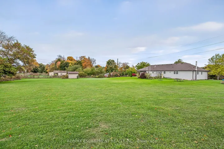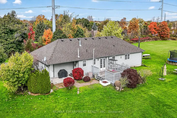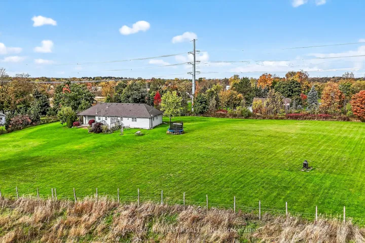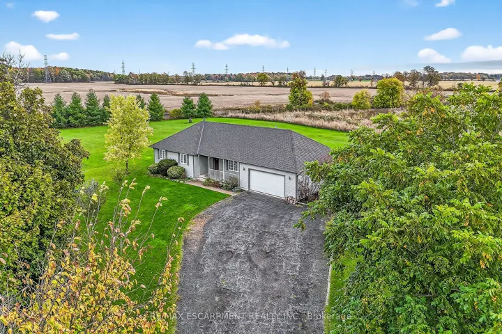 Well cared for fully finished 3 bedroom, 2.5 bath bungalow with two fireplaces (gas & wood stove) situated on fenced 2.24 acre property. Large driveway with ample parking for approximately 10 cars. House is set back a good distance from road & contains two separate entrances (from side of house & from inside garage) to lower level allowing for potential future in-law set up capability. Crown moulding & hardwood flooring is featured throughout the living room, hallway & all bedrooms. Eat-in kitchen showcases oak kitchen cabinets, ceramic backsplash, breakfast bar island, built-in oak desk plus built-in oak hutch/buffet combo, hardwood flooring & patio door to deck & rear yard. Corner gas fireplace with lovely oak surround in living room. Generous sized primary bedroom with walk-in closet & 4 piece ensuite with separate shower & jetted tub. Convenient main floor laundry room provides access to lower level & covered patio & side yard. Lower level offers additional living space with an oversized rec room with laminate flooring & a WETT certified wood stove, den with built-in shelving & a cozy game room plus utility & storage rooms. Newer furnace & central air (2019). Country living with close proximity to main road. Several nearby amenities. Only about a 20 minute drive to Upper Centennial Parkway in Stoney Creek via Highway 20.