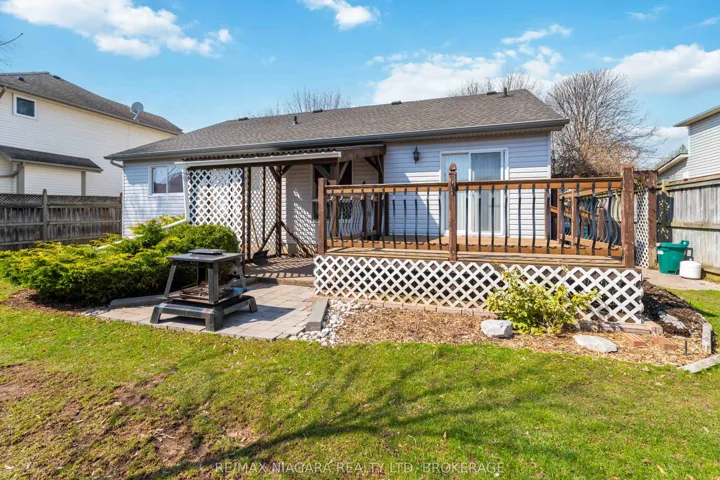 Welcome to this extremely well-maintained 1,183 sq. ft. solid bungalow in the heart of wine country. Built in 1996 and proudly maintained by the original owners. Vaulted ceilings, functional layout, double garage, finished basement, wide lot & numerous updates throughout! Brick & vinyl exterior, maintenance-free porch railing, and a generous driveway offer easy curb appeal. The main level features a tiled foyer with vaulted ceiling, a bright eat-in kitchen with tile flooring and backsplash, and open concept living and dining areas. The living room includes built-in plant shelving & an 11’4″ vaulted ceiling peak. Sliding doors from the dining area lead to the deck & beautiful backyard. Two bedrooms feature dark wood flooring, including the primary with walk-in closet & private ensuite. A main-floor office with French doors and built-in storage provides flexible living space. Inside access from the double car garage. Oak staircase to basement. The finished basement offers ample space with a recently replaced sump pump. Space for potential 3rd bedroom in basement & 3 piece bathroom roughed in. The outdoor features include a rebuilt deck (2017), pergola with stone patio (2021), rebuilt shed (2022), and tested drainage system with emergency sump bypass. Roof replaced in 2018. Insulated & drywalled garage with double-walled insulated door.