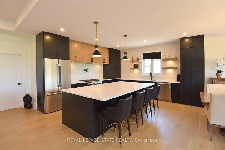 Welcome to 3642 Vosburgh Place, this custom-built 2024 bungalow sits on a quiet court on a premium pie-shaped lot, in Campden Highland Estates on the bench in the beautiful Niagara Escarpment. Offering approximately 4,000 sq. ft. of finished living space, including a walk-up basement. With 3+2 bedrooms and 3.5 bathrooms, it blends modern style with everyday functionality. A covered front porch welcomes you inside to a chef-inspired kitchen featuring sleek black cabinetry, quartz countertops, a large island, Thermador six-burner gas range, built-in refrigerator and dishwasher, appliance garage, deep drawers, and a full pantry cabinet. The elegant living area showcases a tray ceiling and linear gas fireplace set against a dramatic marble-inspired feature wall with custom built-ins. Neutral tones, engineered hardwood, and ceramic flooring create a refined, contemporary feel. Patio doors from the dining area open to a covered rear deck with enclosed storage below- perfect for sunset views. The fully fenced backyard offers ample space and potential for a pool or additional outdoor features. The spacious primary suite includes large windows, a tray ceiling, walk-in closet with pocket door, and double closet. The ensuite features a glass-enclosed tiled shower with rain head and handheld, oval soaker tub, and double floating quartz vanity. Two additional main-floor bedrooms share a four-piece bath, while a two-piece guest bath and laundry/mudroom complete the level. The bright lower level boasts 8-foot ceilings, above-grade windows, and a French door walk-up. Ideal for teens or extended family, it offers a large family room, two bedrooms, den, gym or media room, four-piece bath, storage, and cold room. Carpet-free throughout, the home includes engineered hardwood, ceramic, and laminate flooring, a double-car garage, triple driveway 5+ and Tarion warranty. Minutes to Beamsville/Jordan/Lincoln/QEW, Bruce Trail, award winning wineries, this exceptional home is a must-see. RSA