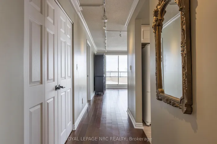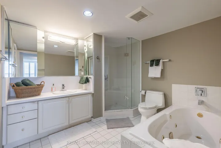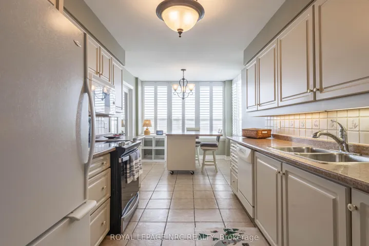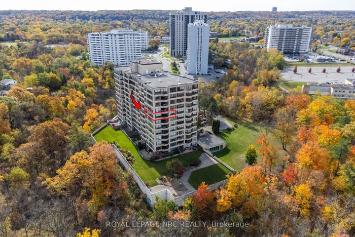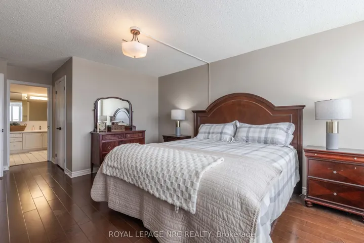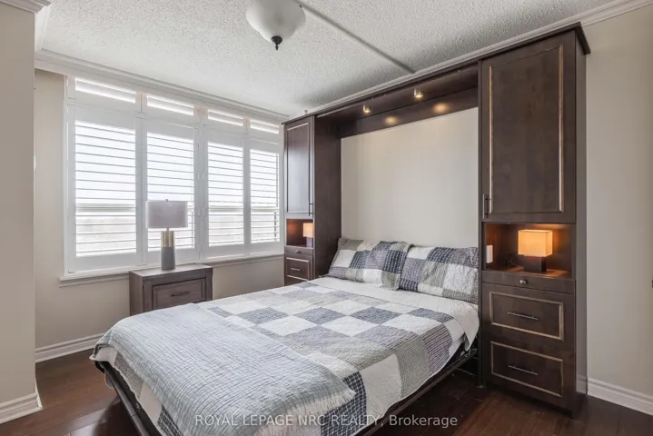 Situated on the 8th floor, this light filled 1,448 square foot corner suite condominium features 2 bedrooms, 2 full bathrooms, and an oversized private balcony off of the great room providing spectacular north-easterly views overlooking the city of St. Catharines and Burgoyne Woods. Upon entering the foyer of Suite 804, you’ll find a tasteful layout full of natural light, hardwood floors, and ceramic tiles in both of the good sized bathrooms as well as the tasteful eat-in kitchen. An in-suite laundry room off of the foyer leads to a second bedroom featuring a custom-built Murphy bed and cabinetry, with a 4pc bathroom close by, making this area completely separate from the rest of the suite and perfect for use as a guest room or office. The kitchen with the separate dinette opens to a light-filled living / dining room through glass French doors, ideal for entertaining. This area also includes a cozy separate TV / reading nook and access to the balcony. The primary suite includes a large walk-in closet and an 4pc ensuite bathroom with a separate shower and jetted spa soaker tub. Suite 804 has lovely easy to clean California (2025) shutters throughout, two heating coils both replaced in 2024 and it also offers 2 indoor parking spaces and 2 separate storage lockers. South Gate, a pet-free building, boasts luxury amenities like an indoor heated pool, spa, sauna’s in both the men’s and women’s change rooms, an exercise room, party room, billiards room, hobby room and 2 separate outdoor barbecue areas with patios. Conveniently close to the Pen Centre, Grocery Stores, Pharmacies, Restaurants, the Meridian Centre, Performing Arts Centre, and everything else that downtown St. Catharines has to offer.