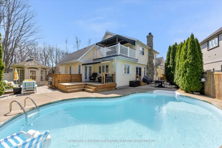 Welcome to 42 Sculler’s Way, in Port Dalhousie’s prestigious Regatta Heights. Custom-built in 2002 by Pym & Cooper, this executive Victorian home sits on a 59′ x 116′ low-maintenance lot on a quiet cul-de-sac. A spacious covered veranda leads into a welcoming foyer and a great room featuring a wood-burning fireplace with Ellicottville stone and a hand-carved mantel. This space flows into the kitchen and dining area, where garden doors open to a large patio and inground pool-ideal for entertaining. The main floor features an elegant formal dining room, a home office, and a spacious primary suite with built-in storage and a newly renovated ensuite. This retreat offers direct access to the pool area. Upstairs, a stained-glass window of the Port Dalhousie Lighthouse lights the way to three generous bedrooms. One bedroom includes skylights and a private balcony overlooking the pool, with direct access to a four-piece bathroom. The basement adds significant living space with a large family room, gas fireplace, and two flexible rooms suitable for bedrooms, an office, or in-law accommodations, plus a four-piece bath and laundry area. With nearly 3,800 sq. ft. of finished space, the home is perfect for both family life and hosting guests. The fully fenced, treed backyard is a private oasis with a large patio, inground pool, and a three-season gazebo equipped with hydro and cable-perfect as a “she-shed” or reading retreat. The property includes an attached double-car garage and an interlock driveway with parking for four. Located minutes from the QEW, Fourth Avenue shopping, and Port Dalhousie’s beach, marina, schools, and restaurants, this home offers an exceptional lakeside lifestyle.