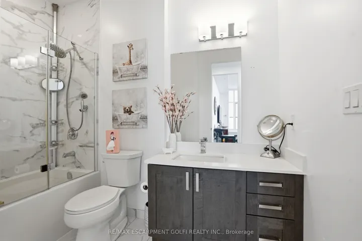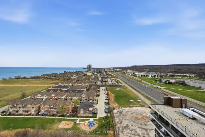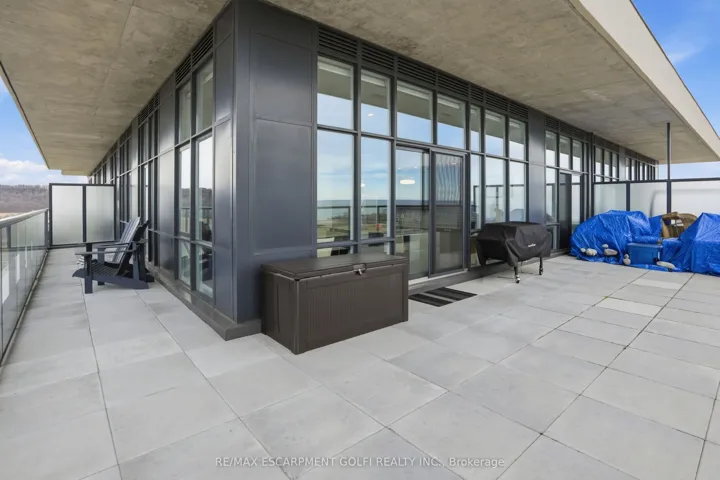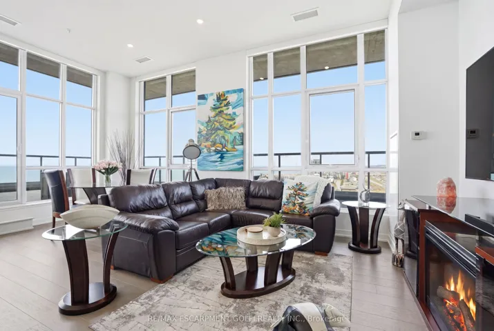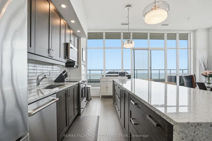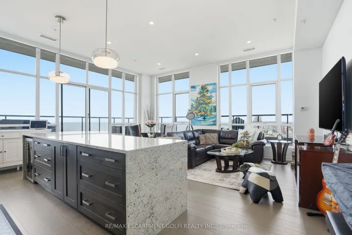 Experience elevated penthouse living in the heart of Grimsby on the Lake, where sweeping views of Lake Ontario, the escarpment, and unforgettable sunsets create a truly exceptional backdrop. Offering approximately 2,000 square feet of combined indoor and outdoor living space, this residence delivers a rare blend of luxury, space, and lifestyle. Soaring 11-foot ceilings and expansive wall to wall windows flood the open concept interior with natural light. The thoughtfully designed living, dining, and kitchen areas are ideal for both everyday living and sophisticated entertaining. The chef’s kitchen features premium appliances, granite countertops, a striking tile backsplash, and an oversized island with generous seating. Two well-appointed bedrooms and two bathrooms provide comfort and privacy, including a serene primary suite with direct access to the terrace, perfect for enjoying evening sunsets over the lake. A standout feature of this penthouse is the expansive wraparound terrace and balcony, offering approximately 900 square feet of outdoor space for entertaining or quiet relaxation. Located within the sought after Waterview Condominium, residents enjoy 24 hour concierge service and are just steps from boutique shops, restaurants, and waterfront trails, with convenient highway access to Niagara and Toronto. A refined lakeside lifestyle awaits, whether as a full time residence or an exceptional retreat.